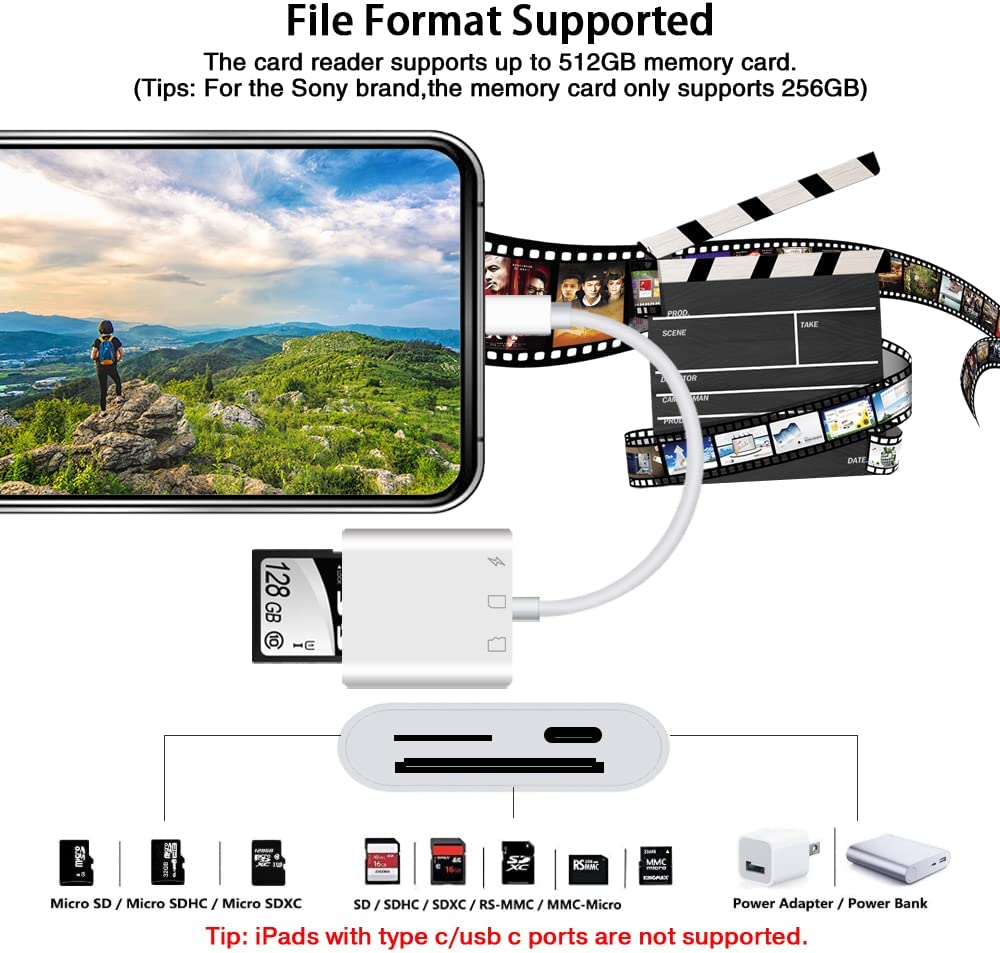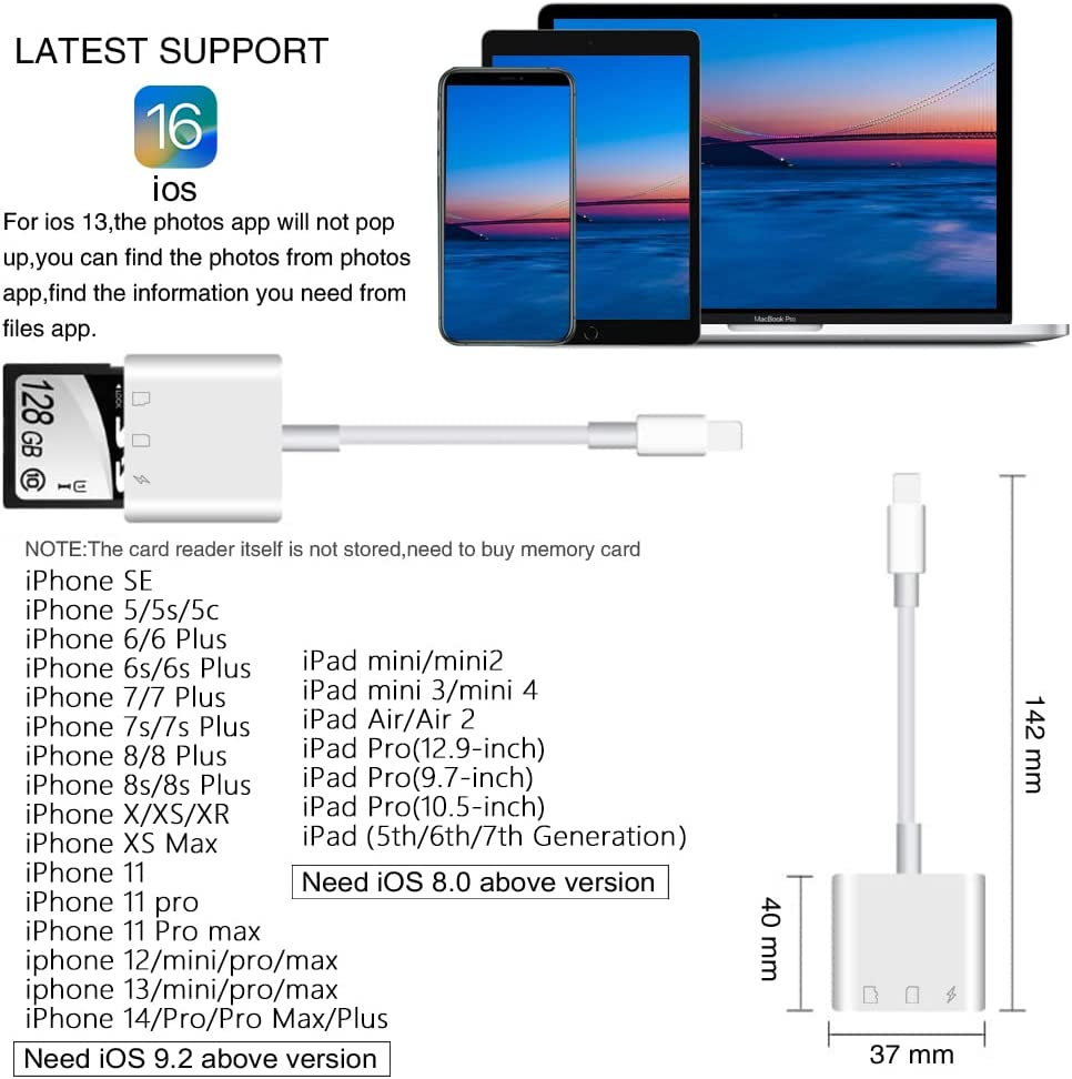 • Capacity and Format Support: The sd card reader for ipad and iphone maximum support for 512GB memory card and tne sd card adapter supports standard photo formats (including JPER and RAW) and SD HD video formats (including H.264 and MPEG-4). For ios13 users, you can transfer photos and videos, and you can also transfer EXCEL, WORD, PDF files.