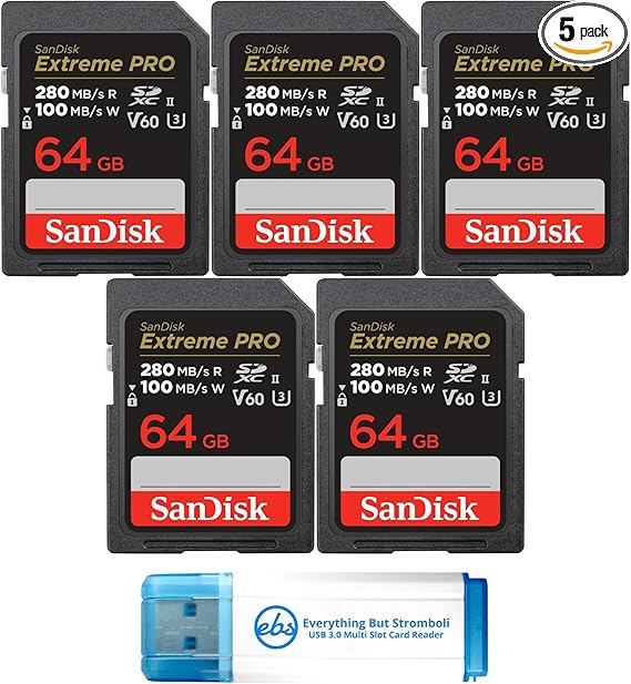 SanDisk (5 Pack) SDXC Memory Card 64GB UHS-II Extreme Pro V60 for Photo and Video (SDSDXEP-064G-GN4IN) Bundle with 1 Everything But Stromboli Micro & SD Card Reader