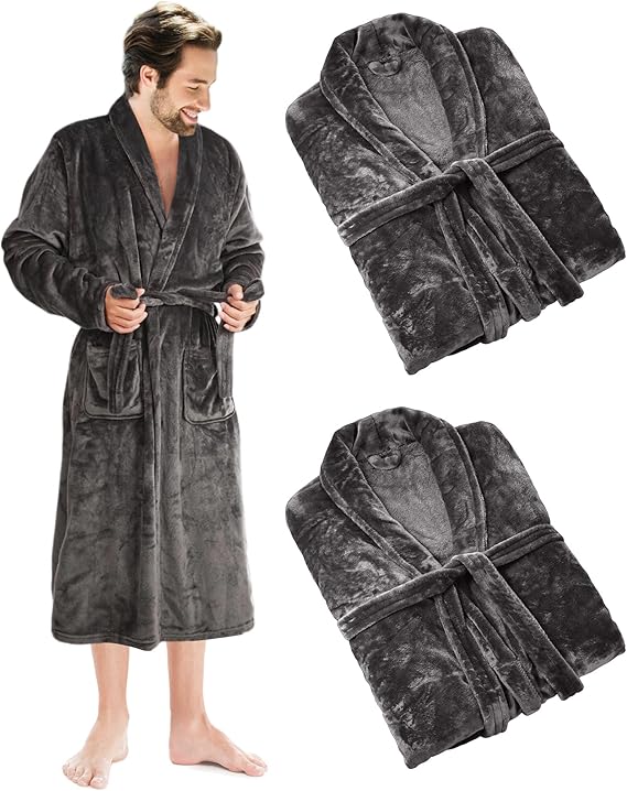 2 Pcs Mens Robe Set Men's Shawl Collar Flannel Bathrobe Plush Robes Soft Spa Robe for Men