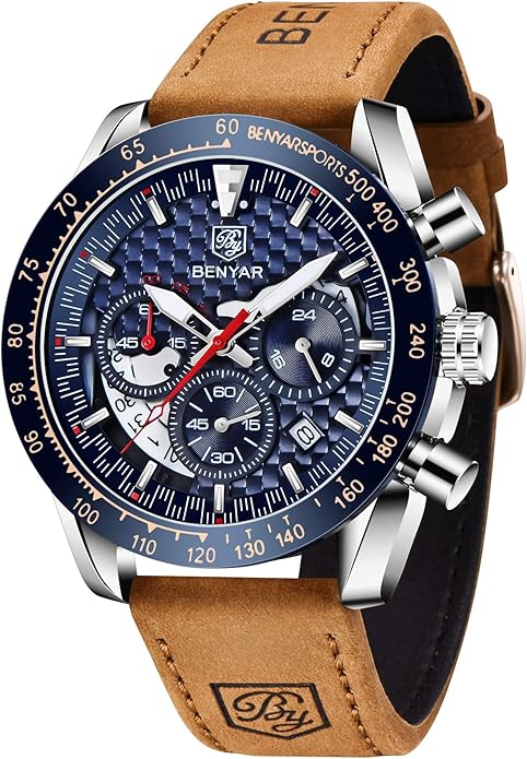 BY BENYAR Mens Watches Sports Stylish Analog Quartz Chronograph Watch Date Waterproof 3ATM Business Leather Strap Wrist Watches for Men