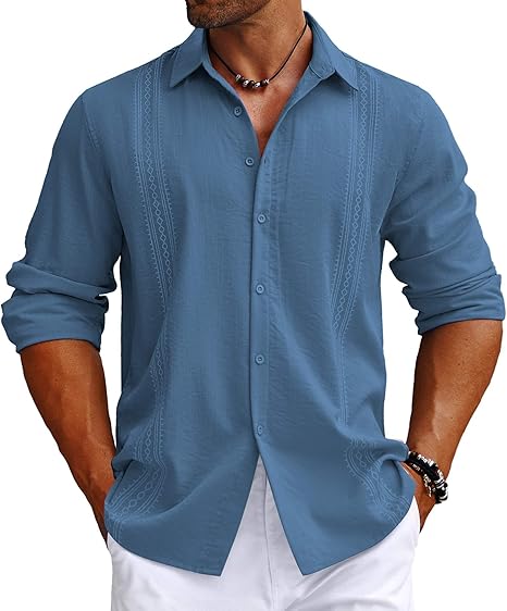 COOFANDY Men's Cuban Guayabera Shirt Long Sleeve Casual Button Down Shirts Beach Linen Shirt
