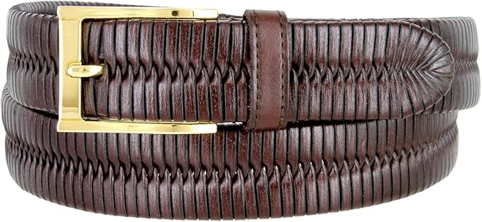 BL040 Polished Gold Plated Buckle Center Weaved Genuine Leather Dress Belt 1-1/4"