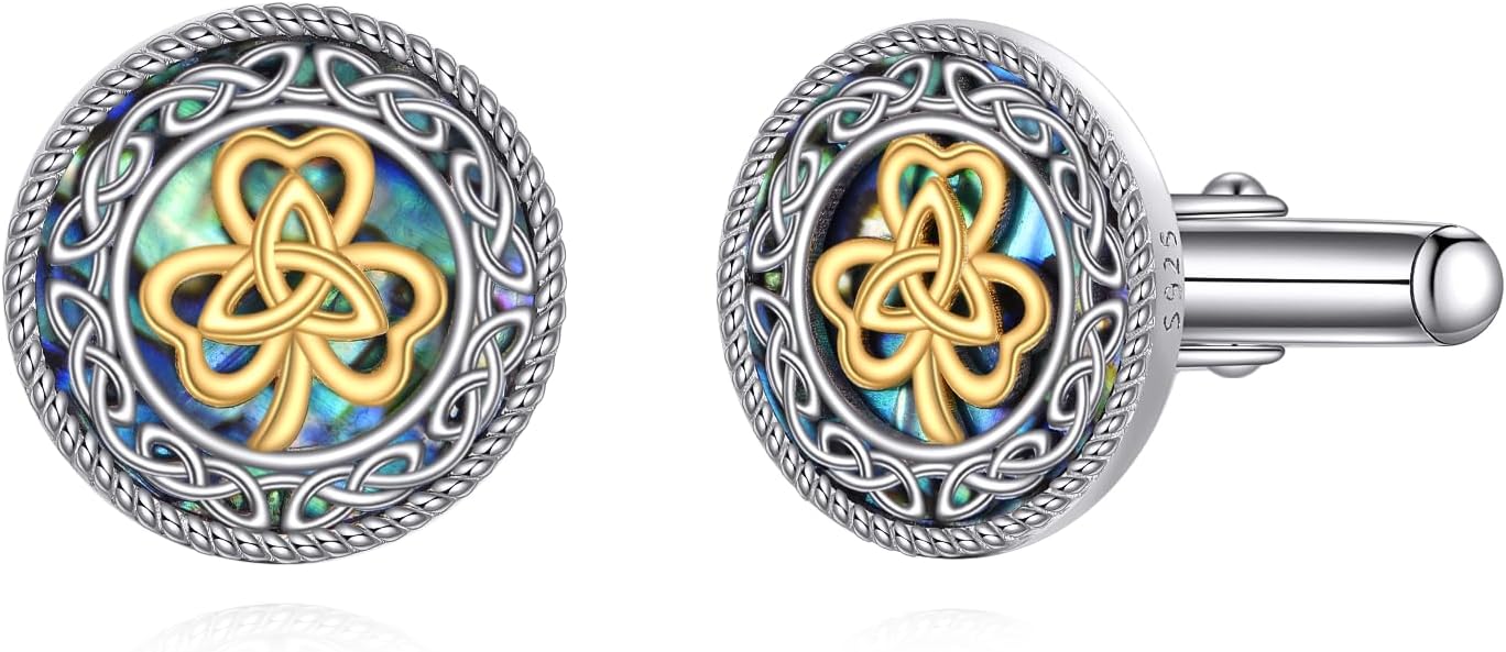 Three Leaf Clover Cufflinks 925 Sterling Silver Abalone Shell Celtic Knot Shamrock Cuff Links Irish Jewelry for Men Father Husband Groomsmen
