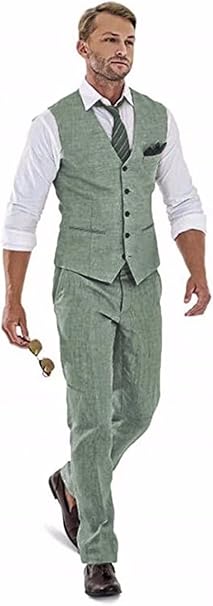 Casual Linen Beige Men's 2 Piece Suits Wedding Suits Slim Fit Groomsmen Tuxedos Summer Linen Vest Pant