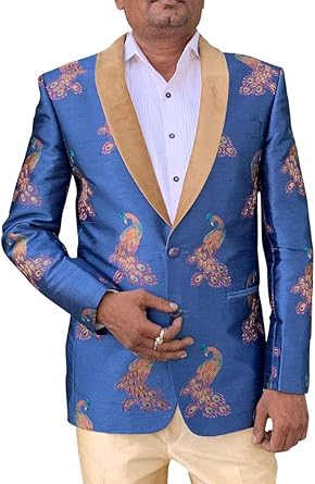 Embroidered Steel Blue Mens Shawl Collar Blazer Sport Jacket Coat SBM1077