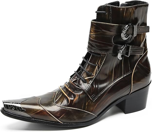 Cowboy Boots for Men Casual Party Dress Genuine Leather Metal Tip Toe Motorcycle Boots Fashion Buckle Zipper Hight Top Western Chelsea Boots for Men