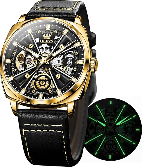OLEVS Mechanical Watches for Men Skeleton Hollow Luxury Fashion Design Mens Wrist Watch Business Casual Leather Strap Male Watches Waterproof Luminous