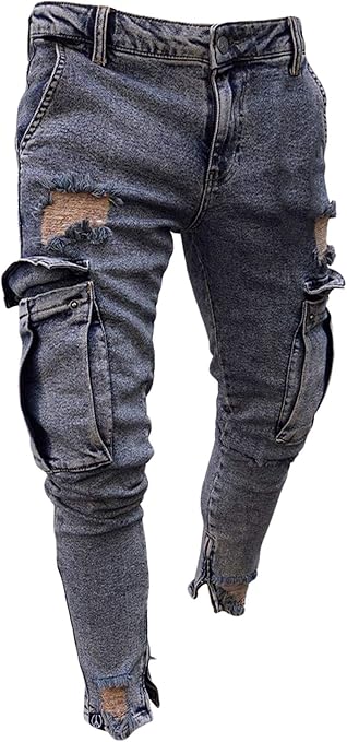 Andongnywell Mens Skinny Stretch Destroyed Denim Pants Ripped Slim Fit Trousers Stretch Knee Pocket Jeans