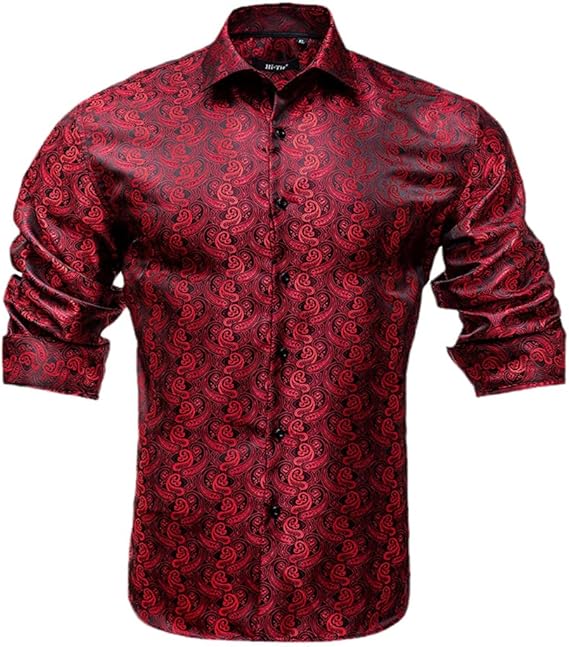 Black Gold Print Floral Paisley Mens Silk Shirt Long Sleeve Casual Shirts for Men Jacquard Male Business Party Wedding