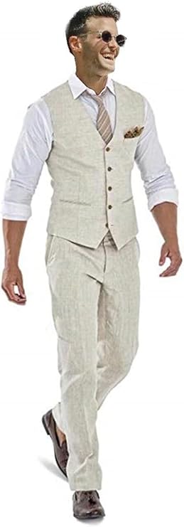 Casual Linen Beige Men's 2 Piece Suits Wedding Suits Slim Fit Groomsmen Tuxedos Prom Waistcoat Summer Linen Vest+Pant
