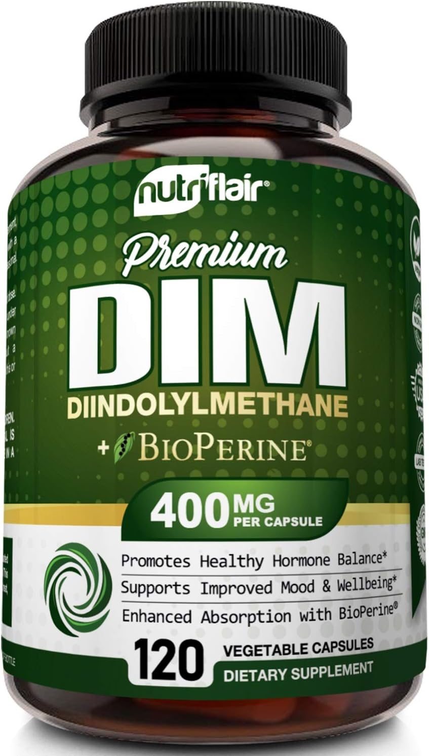 NutriFlair DIM Supplement 400mg with Bioperine, 120 Capsules - Diindolylmethane - Estrogen Metabolism Support & Hormone Balance, Menopause, PCOS, Acne and Skin Care for Men & Women - Compare to 300mg