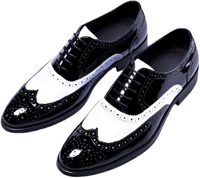 Men Brogue Dress Shoes Lace Up Wing Tips Round Toe Block Heel Patent Premium Genuine Leather