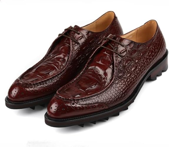 Men Oxford Shoes Lace Up Pointed Toe Brogue Block Heel Flats Crocodile Texture Premium Genuine Leather Burgundy Black