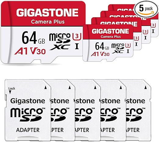 [Gigastone] 64GB 5-Pack Micro SD Card, Camera Plus, MicroSDXC Memory Card for Wyze, Video Camera, Security Camera, Smartphone, Fire tablet, 4K Video Recording, UHS-I U3 A1 V30, 95MB/s, with Adapter