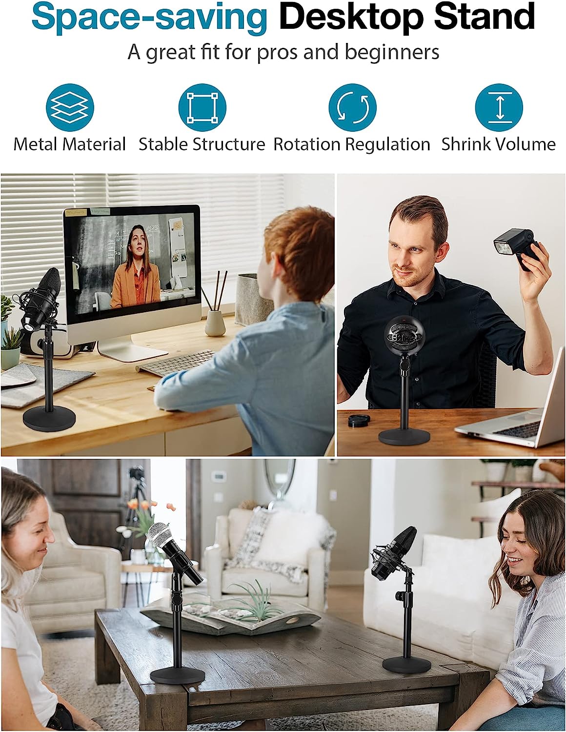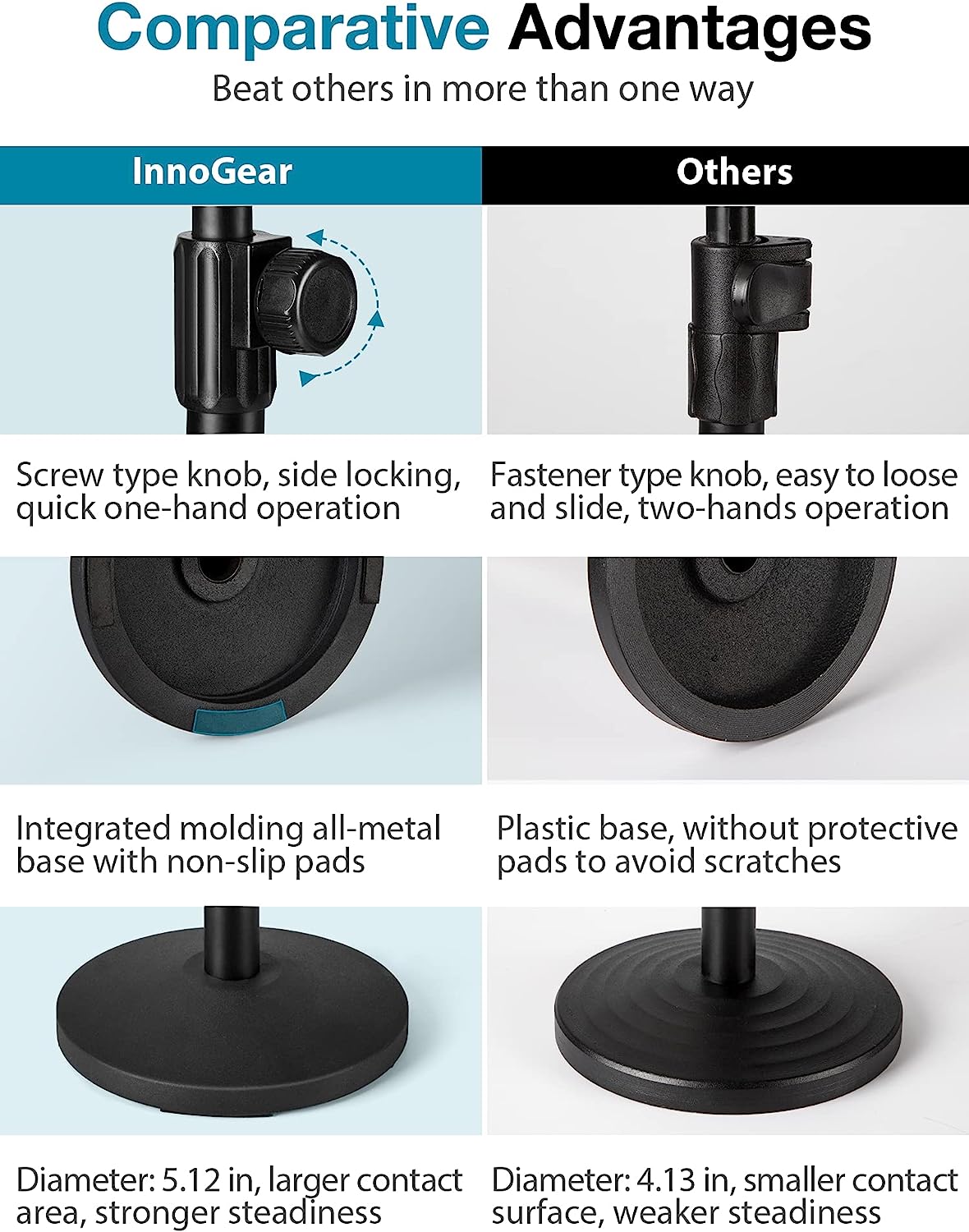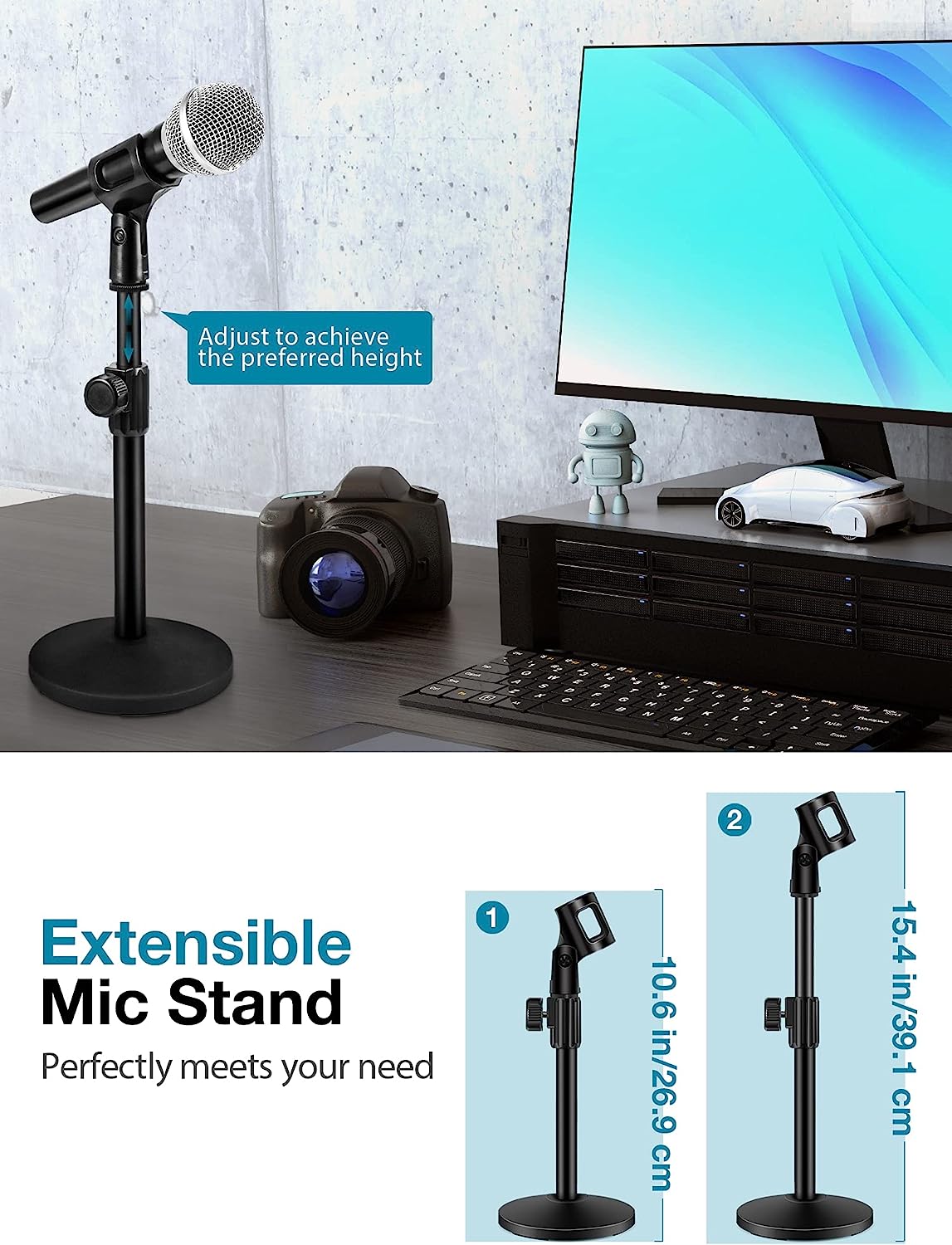 • Our base diameter is bigger and weight of stand has been increased as heavy as 840g(1.85lb) so it won’t be knocked over very easily; the desktop microphone stand is adjustable from 10.6” to 15.4” height.