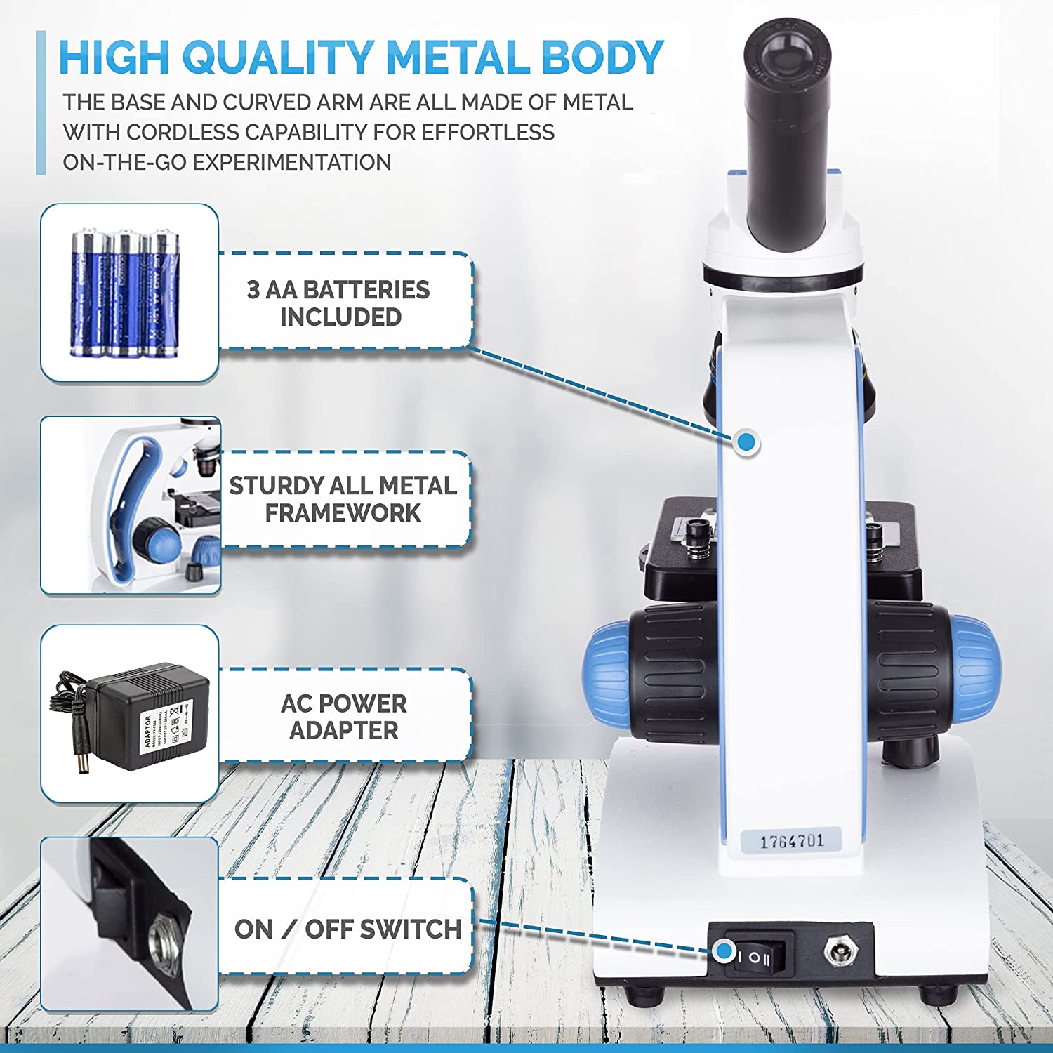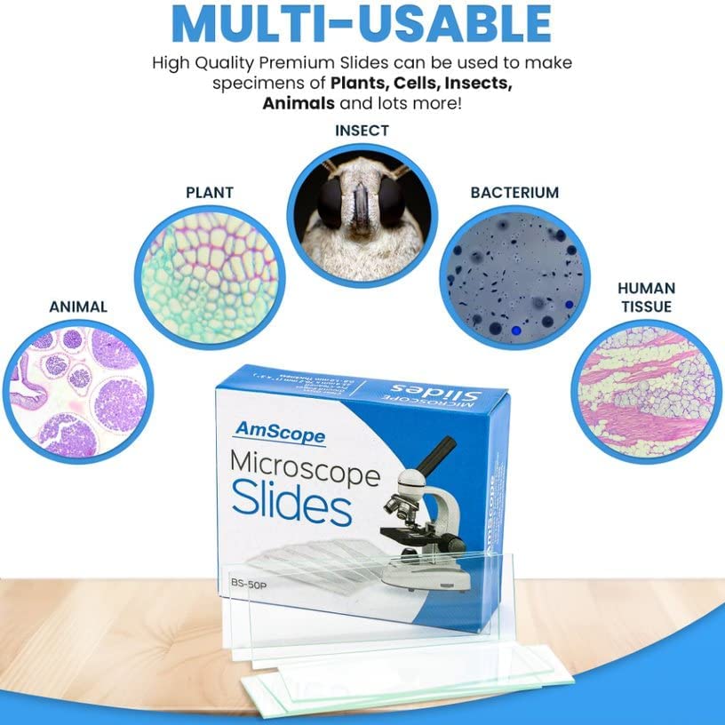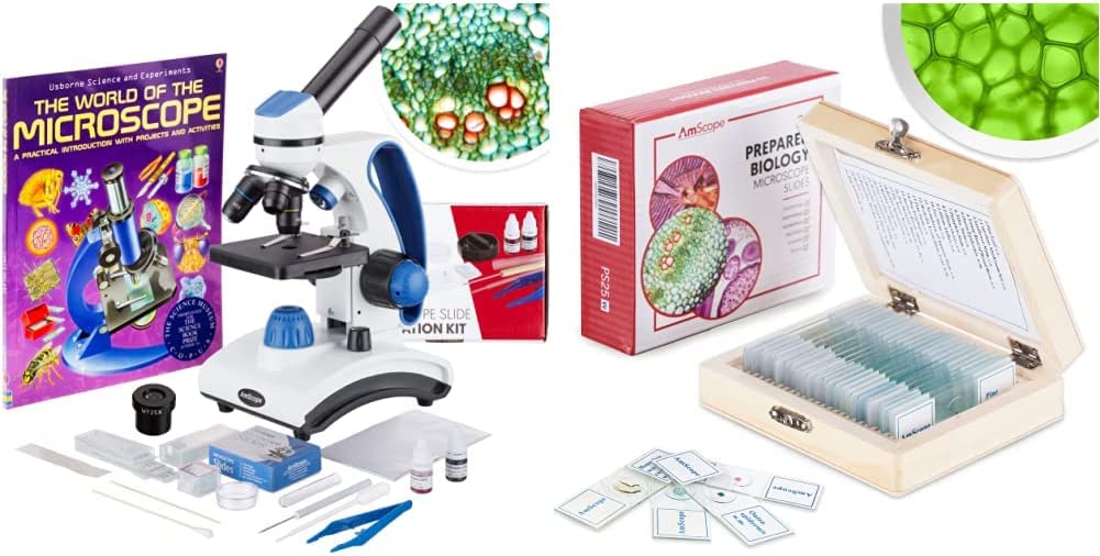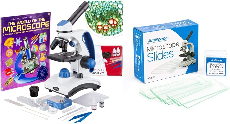 AmScope M162C-2L-PB10-WM-SP14-50P100S 40X-1000X Beginners Microscope Kit for Kids & Students w/Complete Science Accessory Kit + World of The Microscope Book