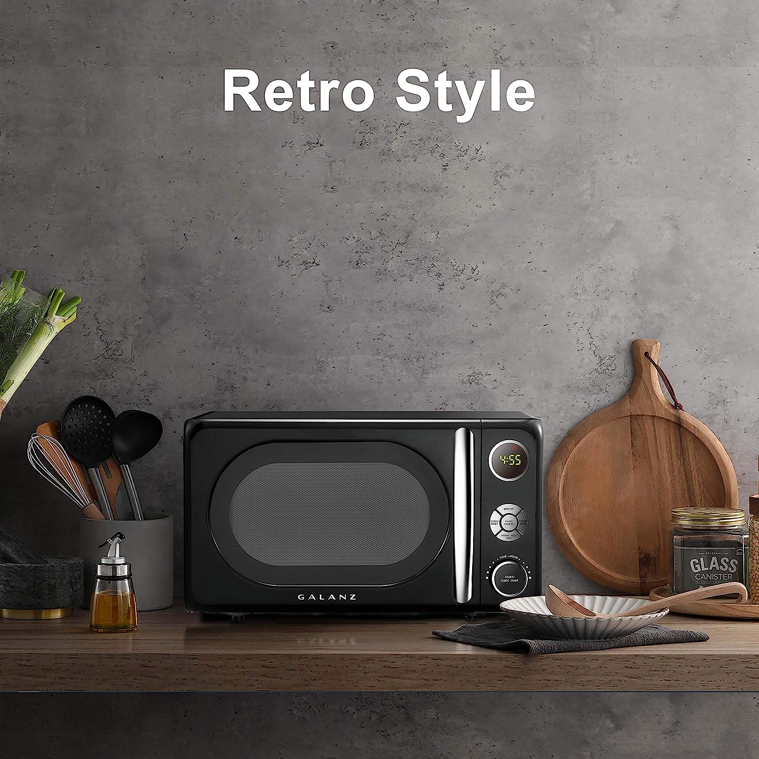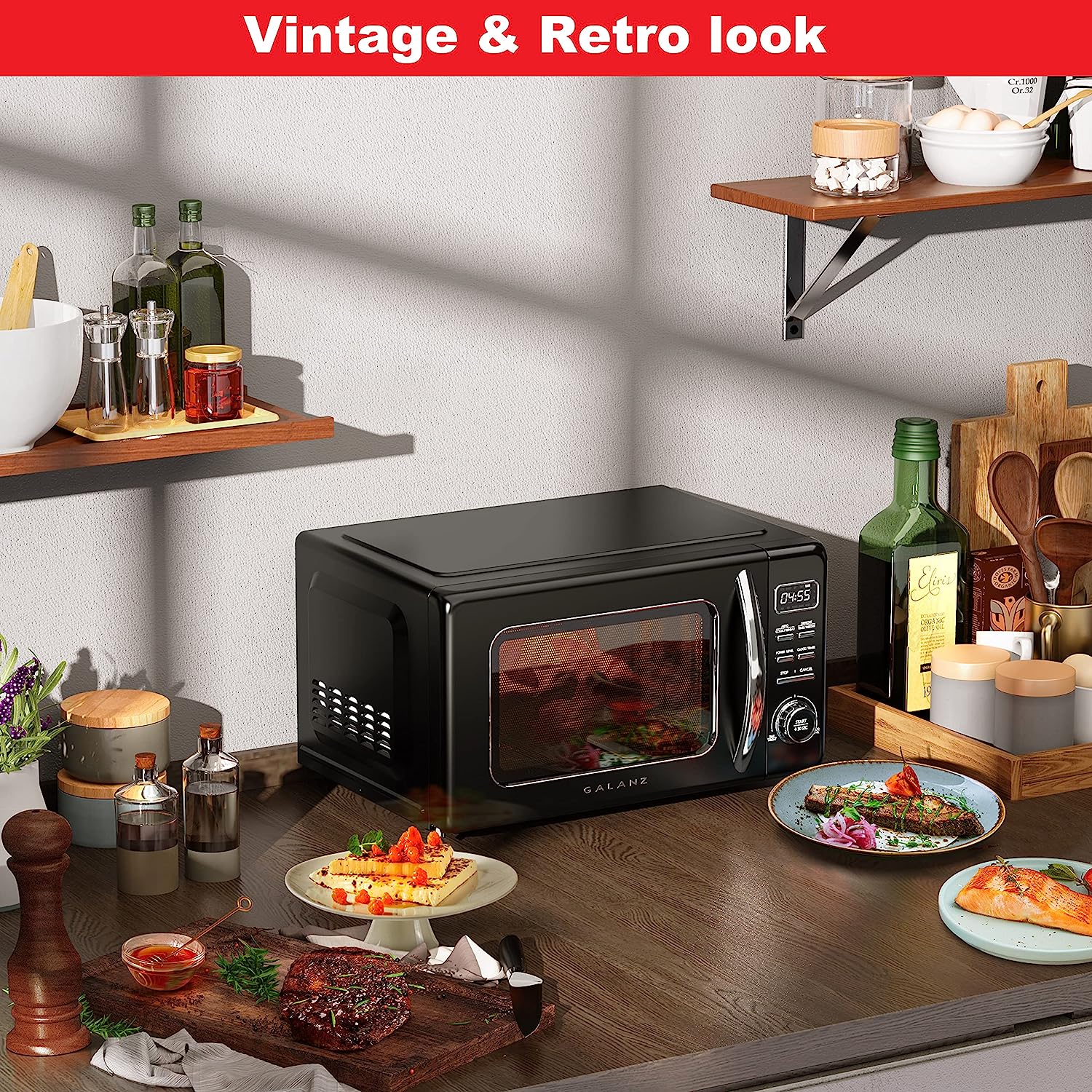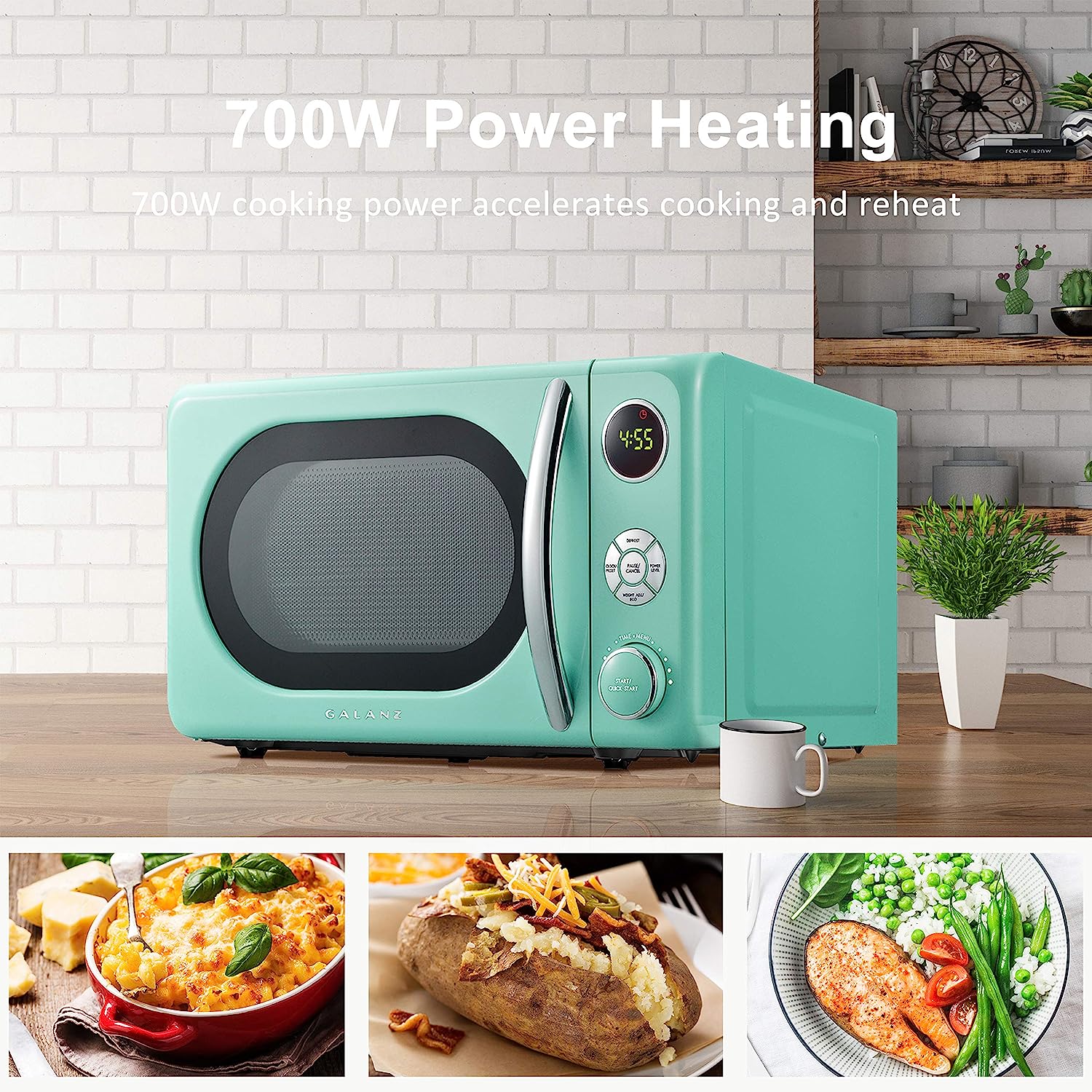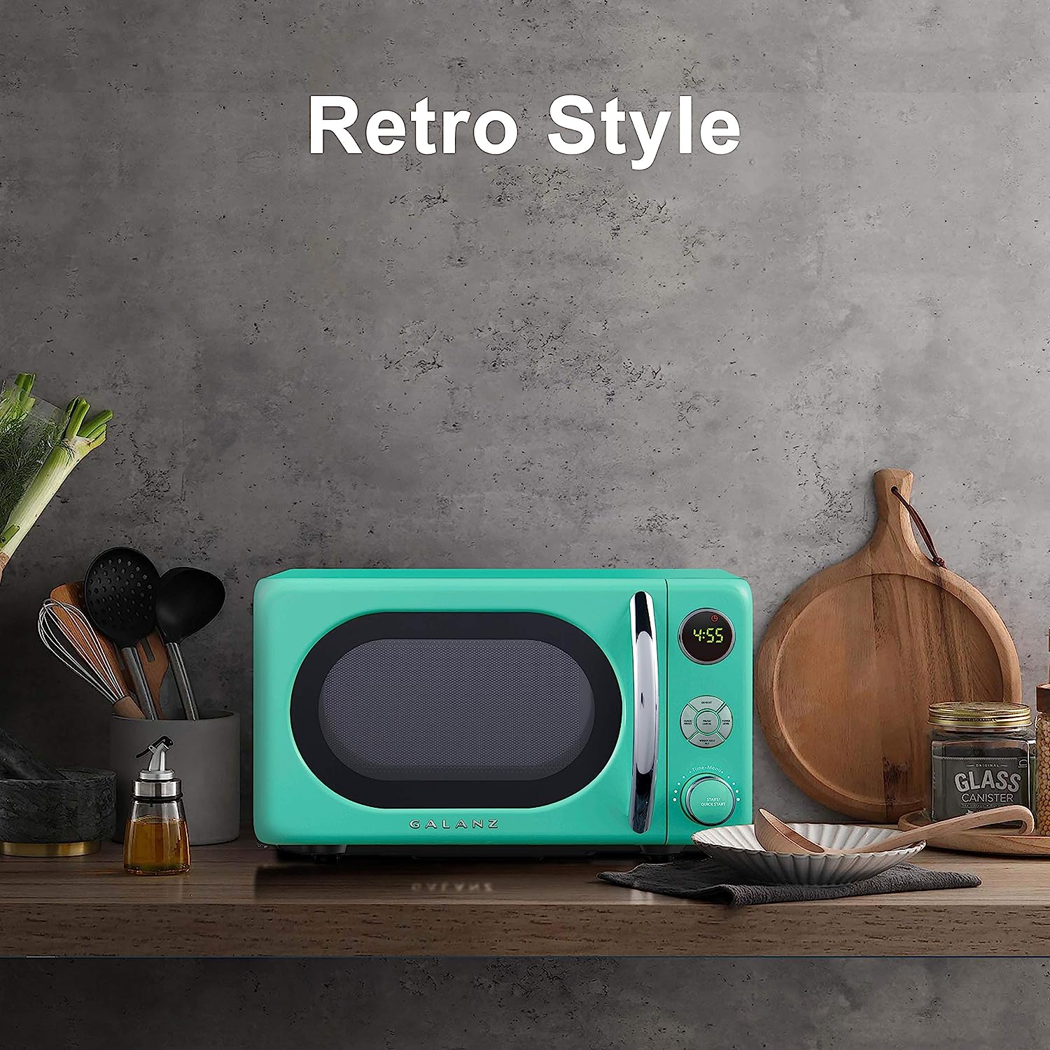 The Galanz Retro Countertop Microwave Oven makes cooking and reheating meals or beverages simple, quick, and convenient while adding a fun and stylish addition to any kitchen, rec room, home office or dorm room. Defrost any of your frozen foods by either weight or time; Also includes a quick start, +30 seconds button for when you need additional cooking time for your meal. LED Display and easy to use push buttons include 7 Auto Cooking programs and 10 Auto Reheat Programs making cooking and reheating meals and beverages simple, quick, easy & convenient! Removable for easy clean up, the Galanz Retro Countertop Microwave Oven includes a 9.6" glass turntable that rotates 360 degrees for even and efficient cooking. Vintage and retro look will accentuate any space! Mix and match with the other retro appliances from Galanz like the toaster oven, freezer, & refrigeration pieces. The compact size is perfect for apartments, kitchenettes, dorms, and other small kitchen spaces - Measures 17.5" W x 14" D x 9.5" H with a capacity of 0.7 cu ft.