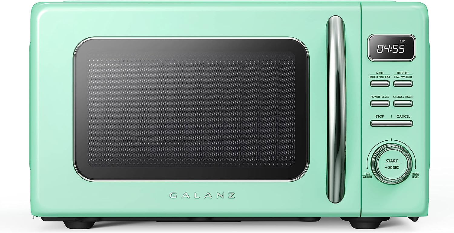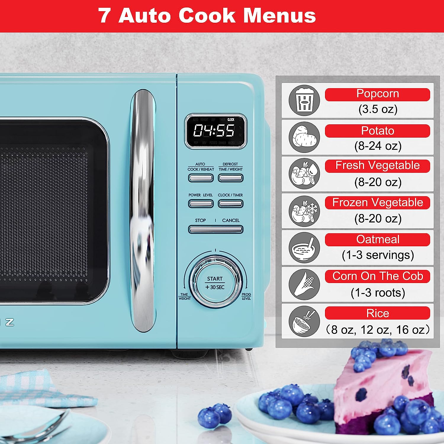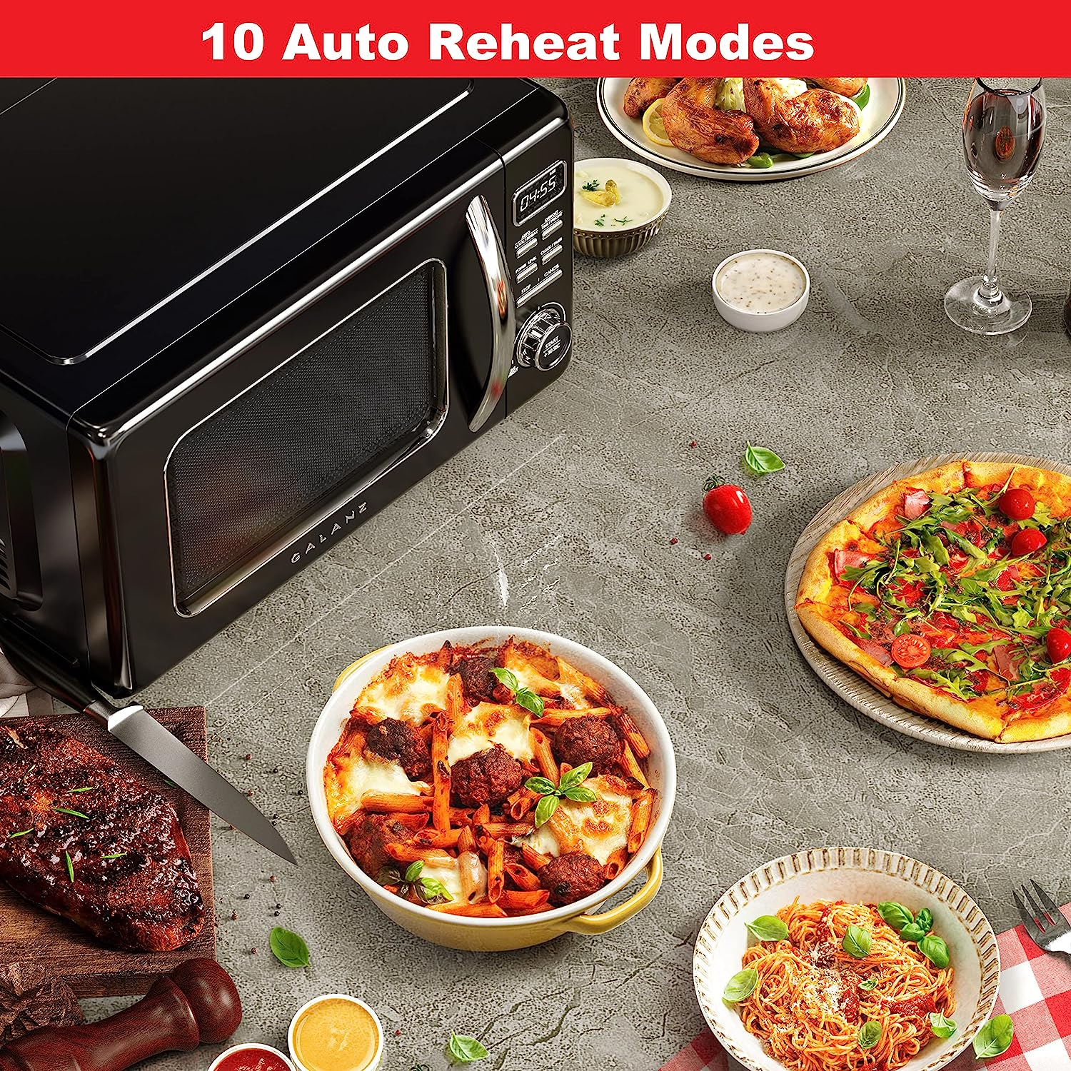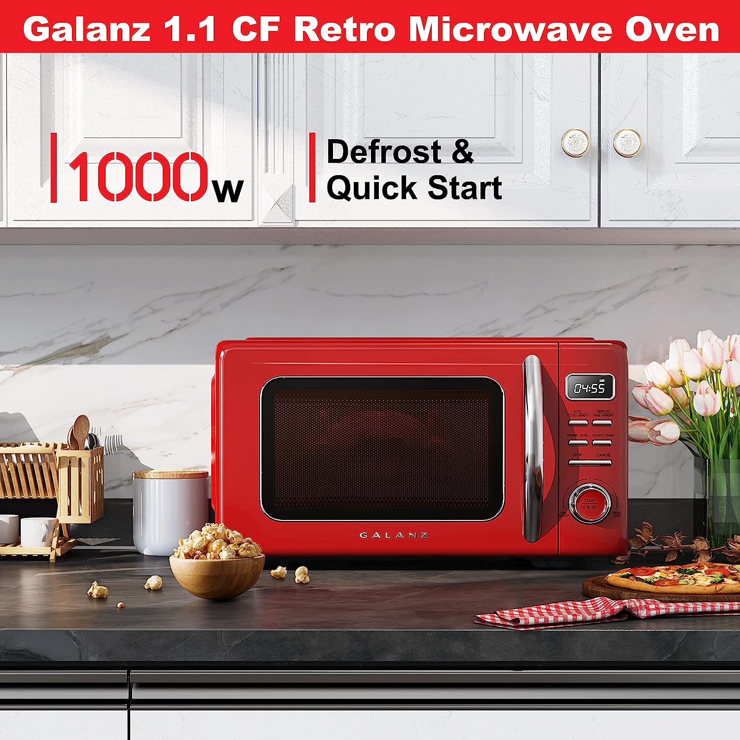 The Galanz Retro Countertop Microwave Oven makes cooking and reheating meals or beverages simple, quick, and convenient while adding a fun and stylish addition to any kitchen, rec room, home office or dorm room. Defrost any of your frozen foods by either weight or time; Also includes a quick start, +30 seconds button for when you need additional cooking time for your meal. LED Display and easy to use push buttons include 7 Auto Cooking programs and 10 Auto Reheat Programs making cooking and reheating meals and beverages simple, quick, easy & convenient! Removable for easy clean up, the Galanz Retro Countertop Microwave Oven includes a 9.6" glass turntable that rotates 360 degrees for even and efficient cooking. Vintage and retro look will accentuate any space! Mix and match with the other retro appliances from Galanz like the toaster oven, freezer, & refrigeration pieces. The compact size is perfect for apartments, kitchenettes, dorms, and other small kitchen spaces - Measures 17.5" W x 14" D x 9.5" H with a capacity of 0.7 cu ft.