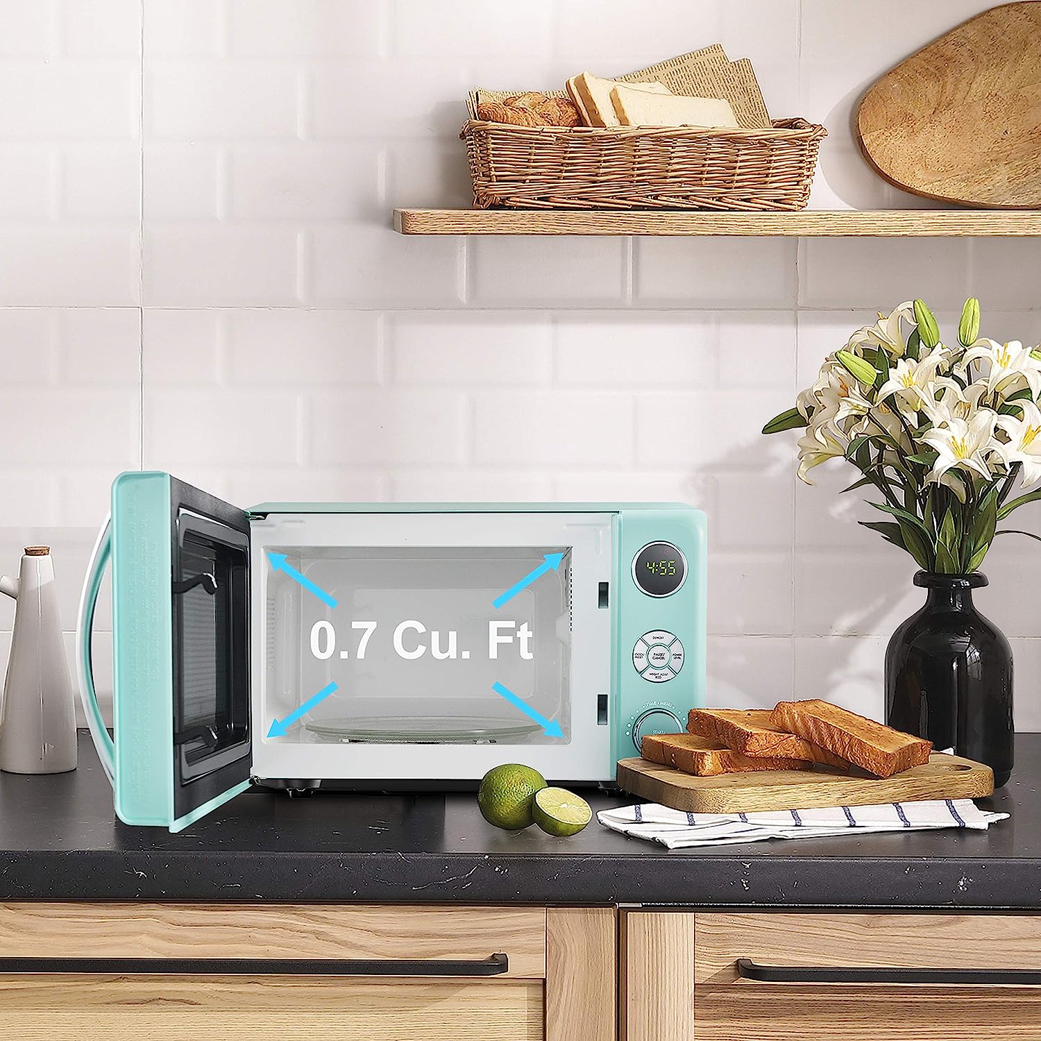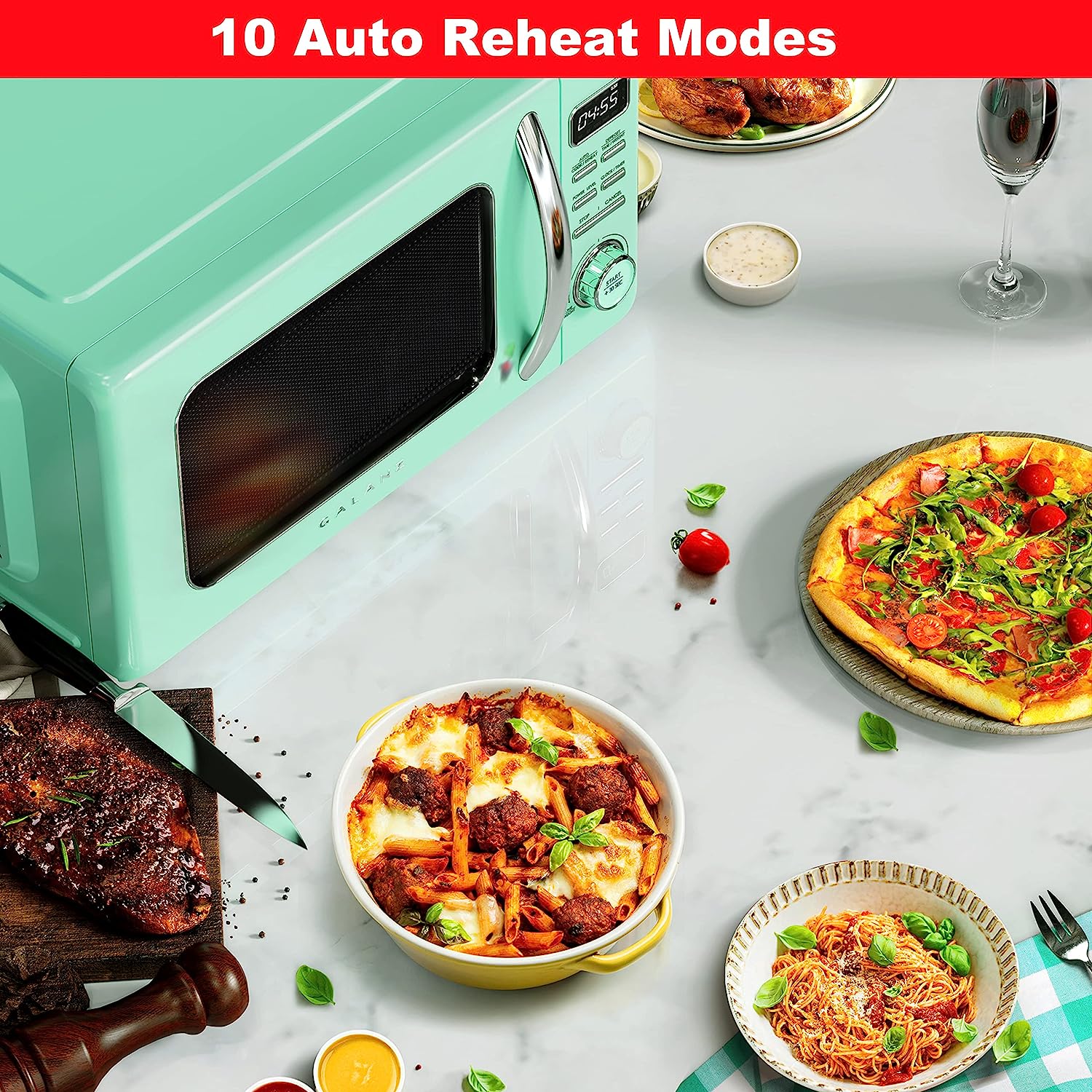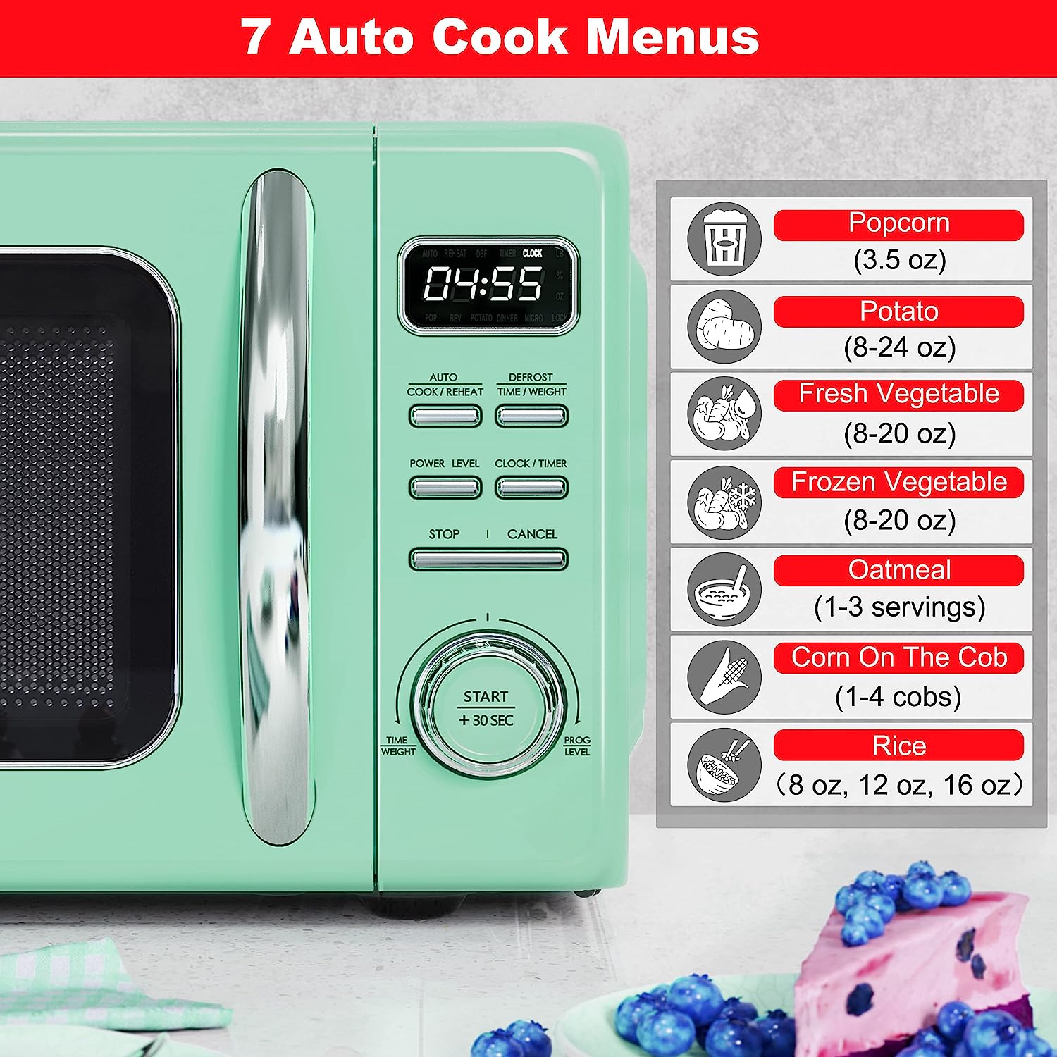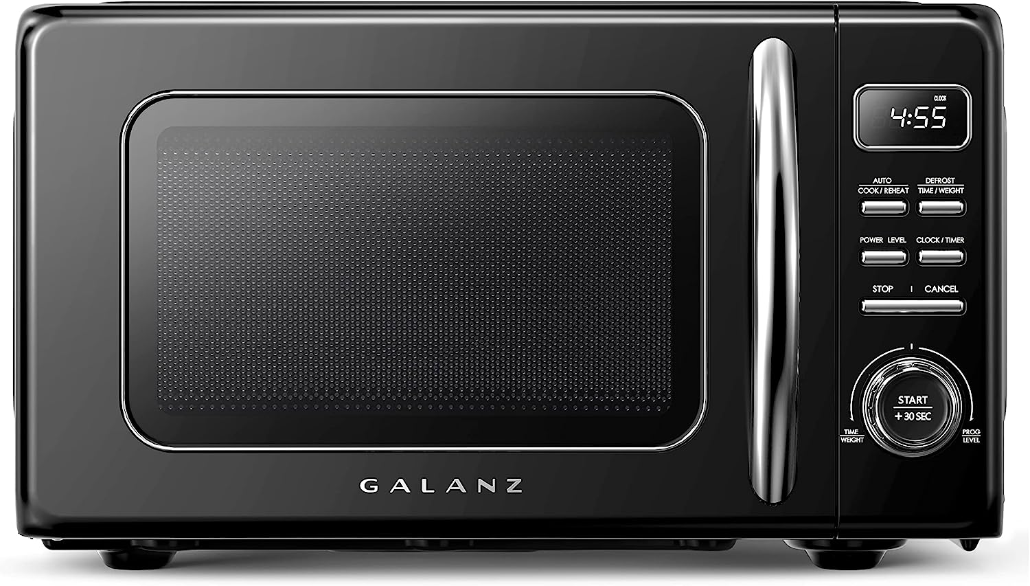 The Galanz Retro Countertop Microwave Oven makes cooking and reheating meals or beverages simple, quick, and convenient while adding a fun and stylish addition to any kitchen, rec room, home office or dorm room. Defrost any of your frozen foods by either weight or time; Also includes a quick start, +30 seconds button for when you need additional cooking time for your meal. LED Display and easy to use push buttons include 7 Auto Cooking programs and 10 Auto Reheat Programs making cooking and reheating meals and beverages simple, quick, easy & convenient! Removable for easy clean up, the Galanz Retro Countertop Microwave Oven includes a 9.6" glass turntable that rotates 360 degrees for even and efficient cooking. Vintage and retro look will accentuate any space! Mix and match with the other retro appliances from Galanz like the toaster oven, freezer, & refrigeration pieces. The compact size is perfect for apartments, kitchenettes, dorms, and other small kitchen spaces - Measures 17.5" W x 14" D x 9.5" H with a capacity of 0.7 cu ft.