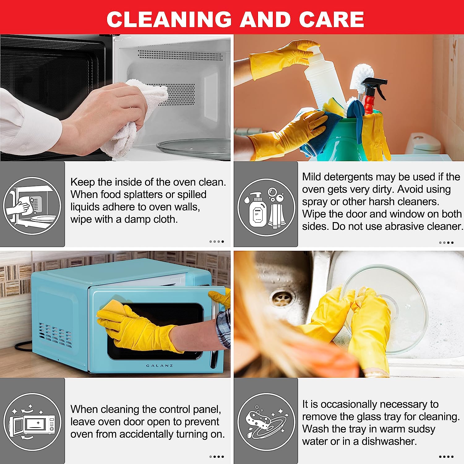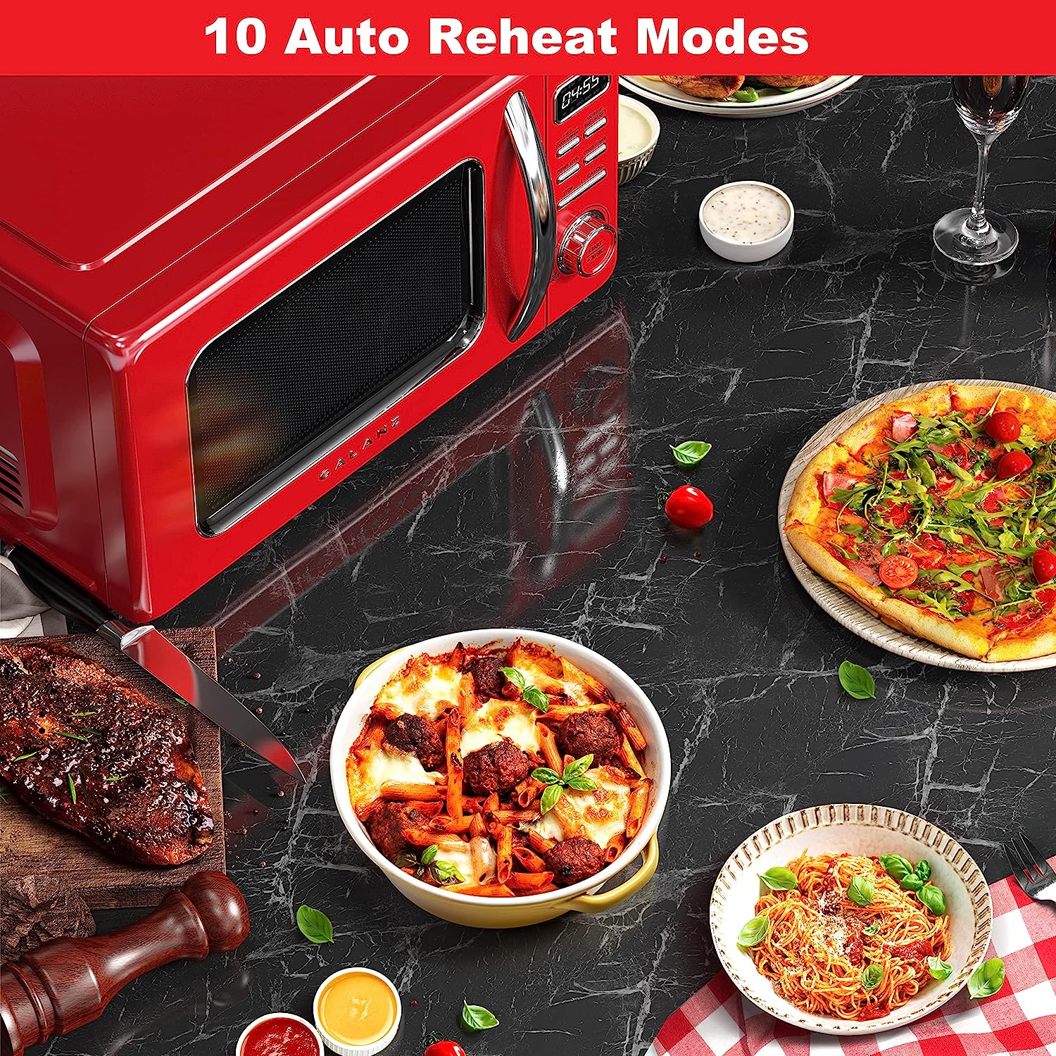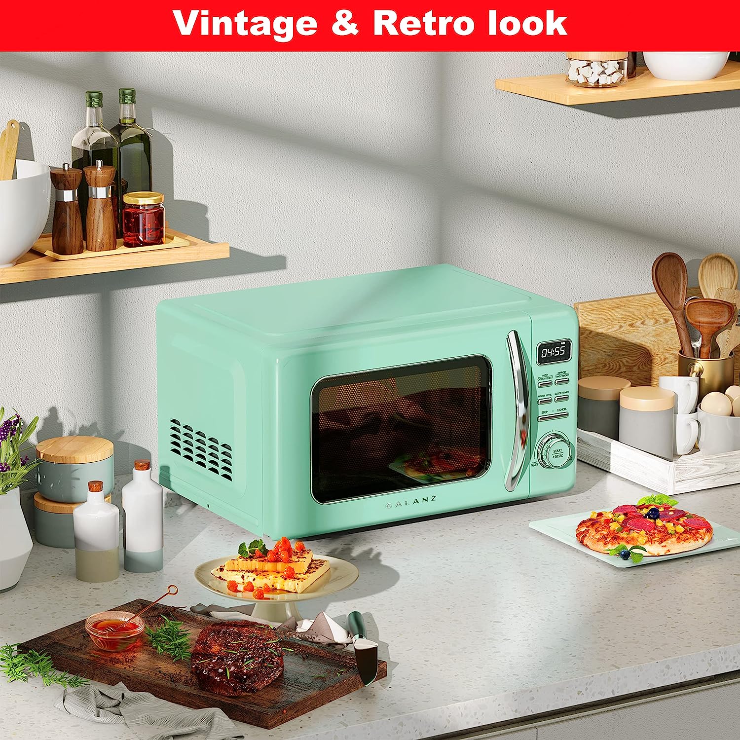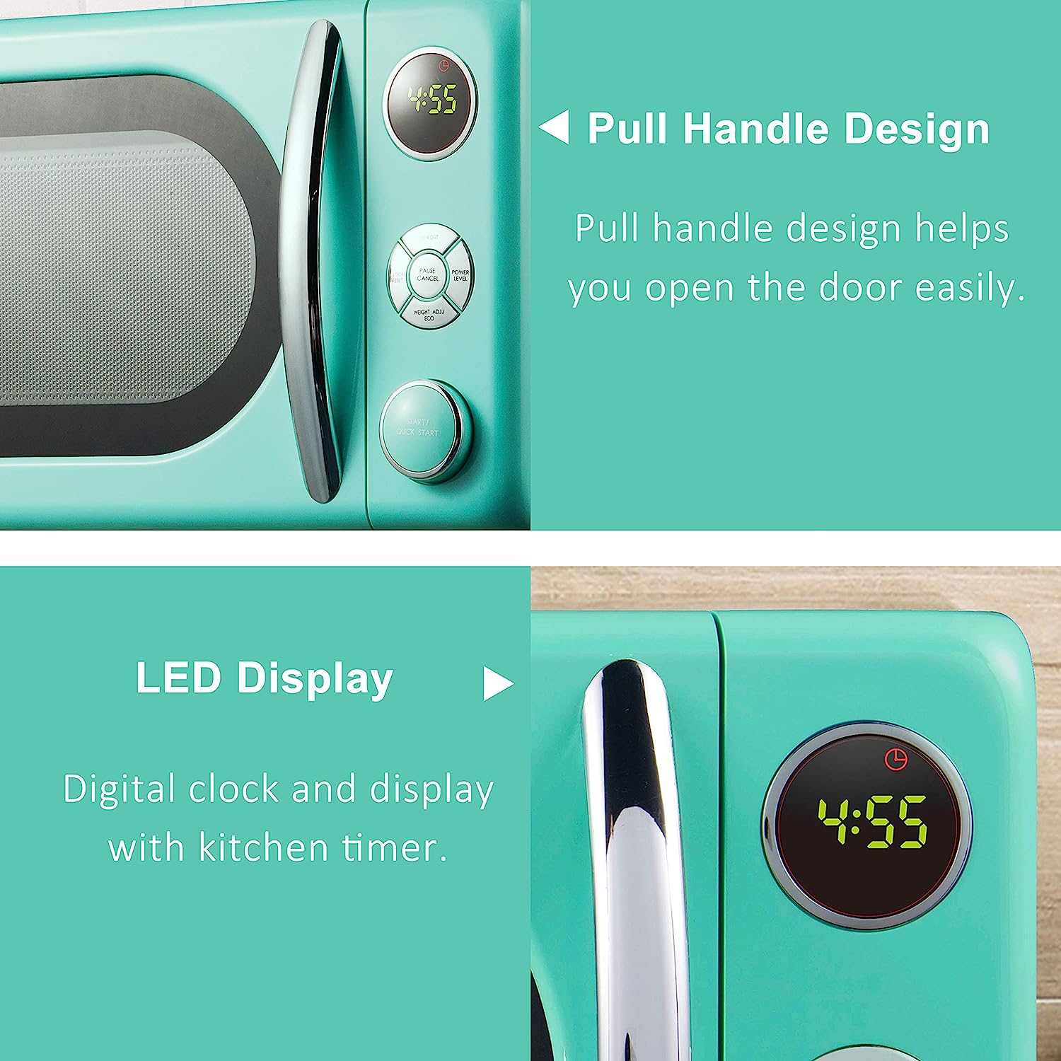 The Galanz Retro Countertop Microwave Oven makes cooking and reheating meals or beverages simple, quick, and convenient while adding a fun and stylish addition to any kitchen, rec room, home office or dorm room. Defrost any of your frozen foods by either weight or time; Also includes a quick start, +30 seconds button for when you need additional cooking time for your meal. LED Display and easy to use push buttons include 7 Auto Cooking programs and 10 Auto Reheat Programs making cooking and reheating meals and beverages simple, quick, easy & convenient! Removable for easy clean up, the Galanz Retro Countertop Microwave Oven includes a 9.6" glass turntable that rotates 360 degrees for even and efficient cooking. Vintage and retro look will accentuate any space! Mix and match with the other retro appliances from Galanz like the toaster oven, freezer, & refrigeration pieces. The compact size is perfect for apartments, kitchenettes, dorms, and other small kitchen spaces - Measures 17.5" W x 14" D x 9.5" H with a capacity of 0.7 cu ft.