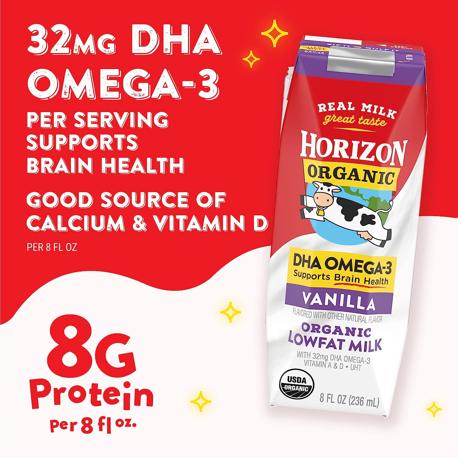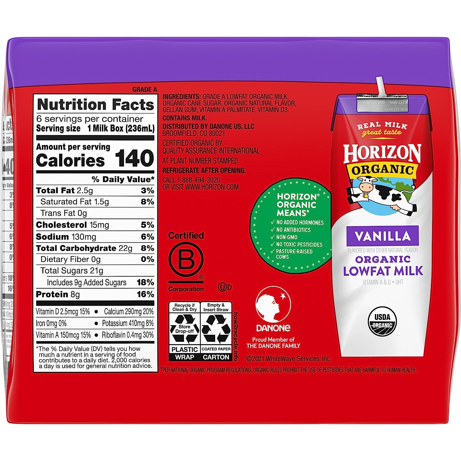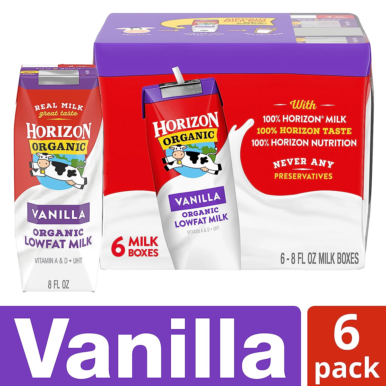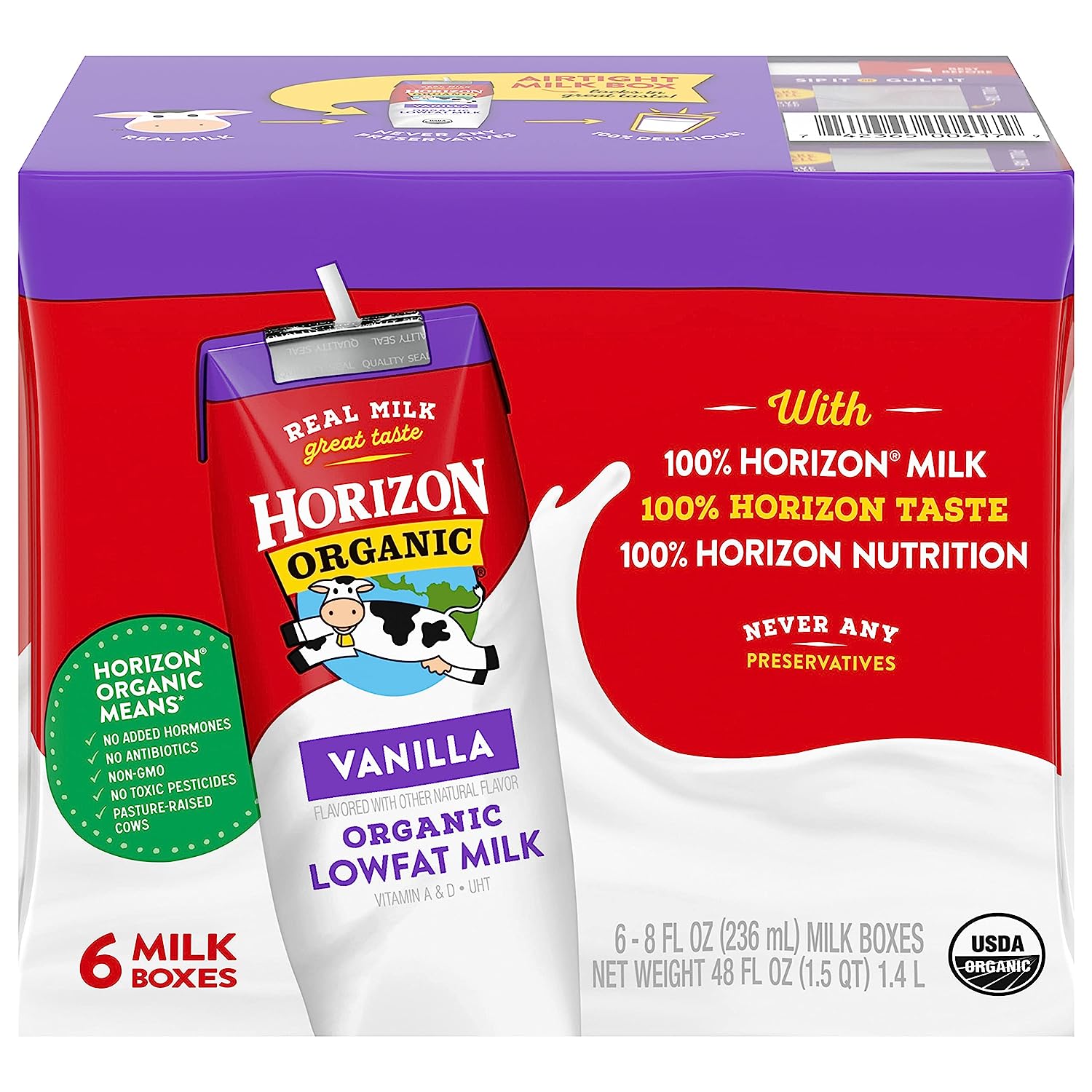 Take the organic goodness of Horizon milk on-the-go with Horizon Organic UHT 1% Lowfat Vanilla Milk Boxes. Great as a lunchbox stuffer or snack, these single-serve milk boxes offer a wholesome alternative to juice boxes. Each milk box provides many nutrients, including vitamin A, vitamin D, and 8 grams of protein. And thanks to their special packaging, these shelf-stable milk boxes lock in delicious taste without refrigeration. *No significant difference has been shown between milk from rbST-treated & non rbST-treated cows.