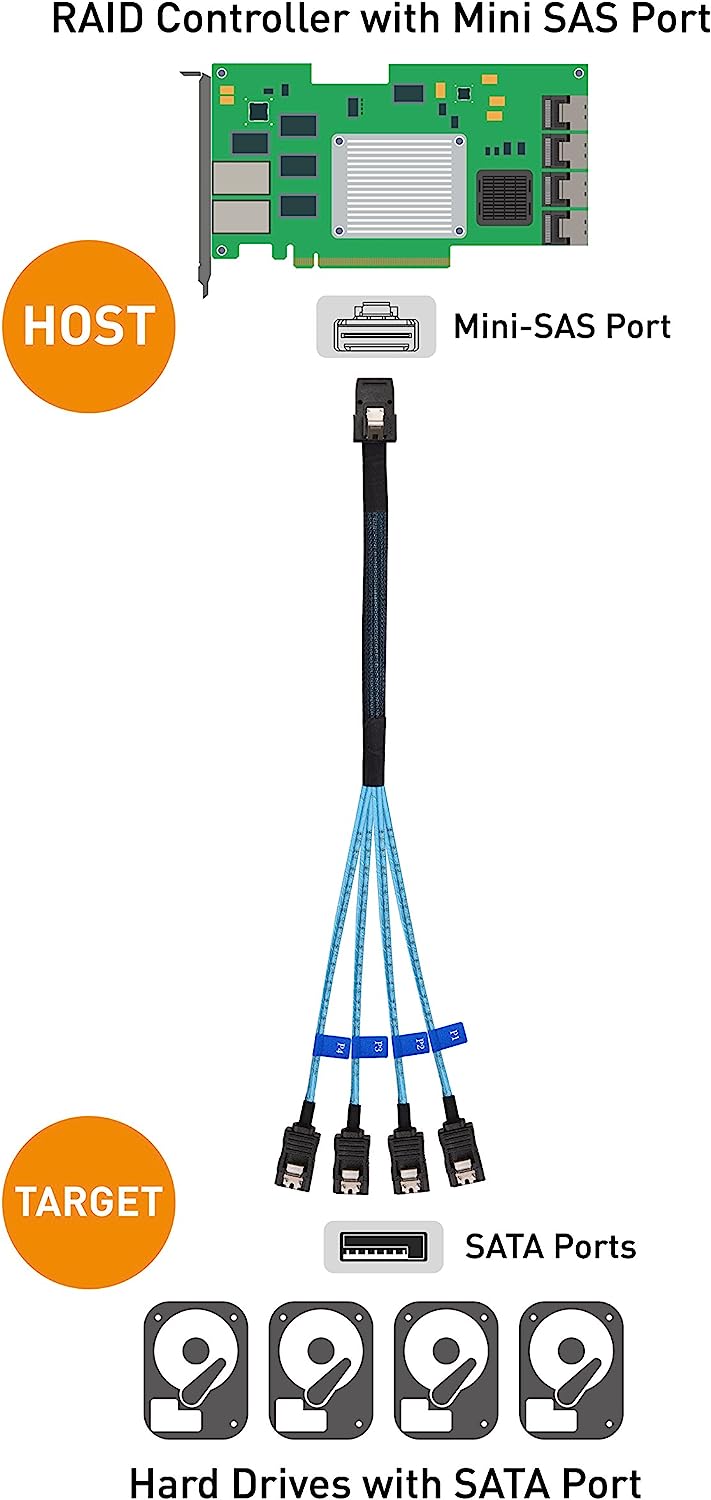 • Internal Mini SAS data cable connects a RAID or PCIe controller with an SFF-8087 port to 4 discrete SATA drives; Mini SAS to SATA adapter provides reliable internal connectivity between a Serial attached SCSI controller card in a computer system and direct attached storage devices with a SATA connector