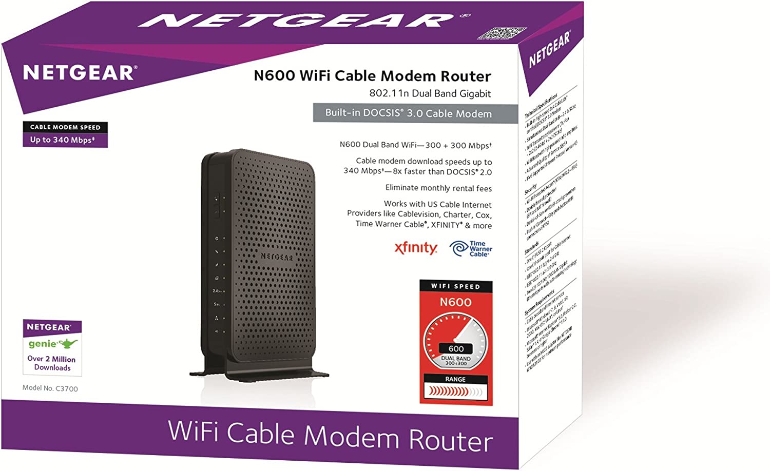 The NETGEAR N600 WiFi DOCSIS 3.0 Cable Modem Router with N600 simultaneous dual band WiFi router and integrated DOCSIS 3.0 cable modem, provides 8x faster download speeds, up to 340 Mbps. It’s CableLabs DOCSIS 3.0 Certified to work with U.S. cable Internet providers like XFINITY from Comcast, Spectrum, Cox & more.