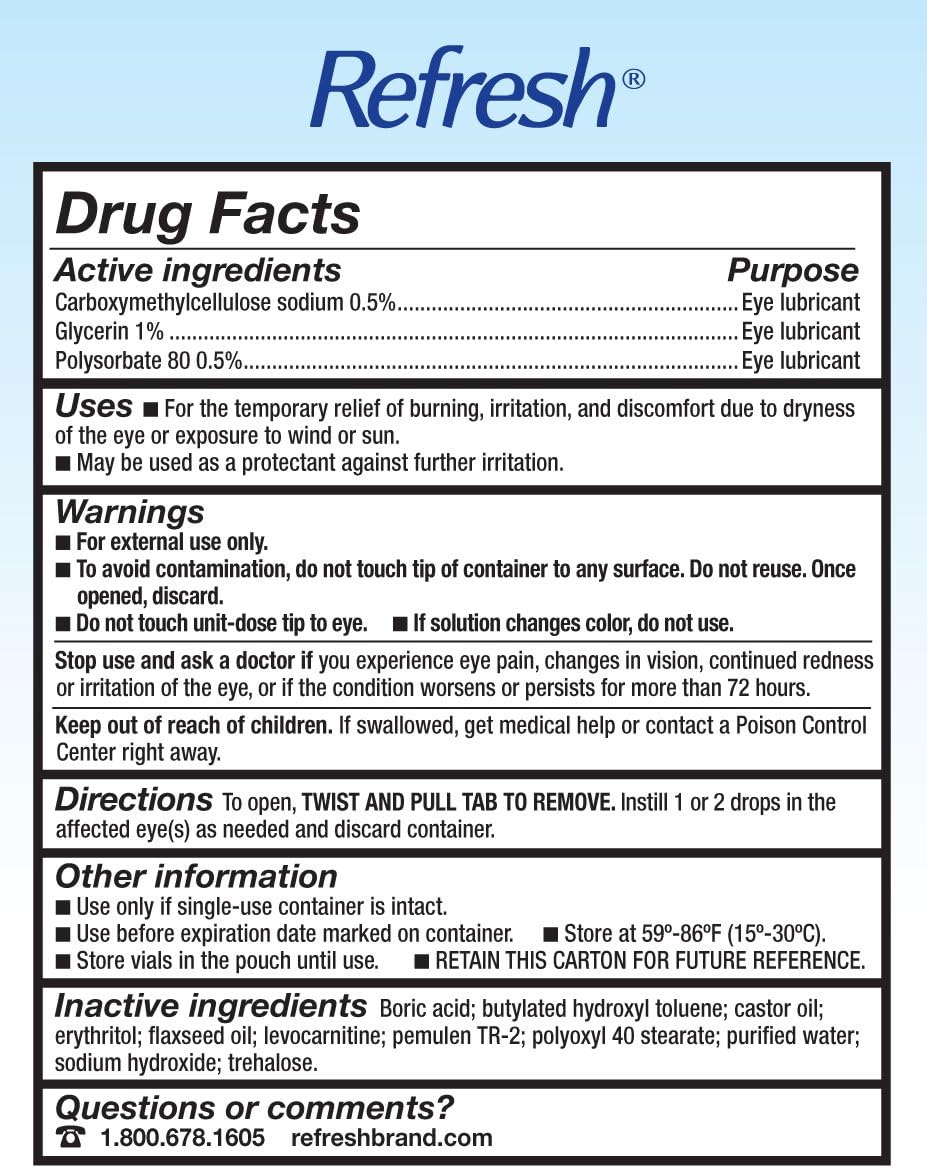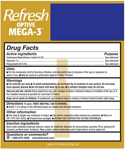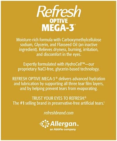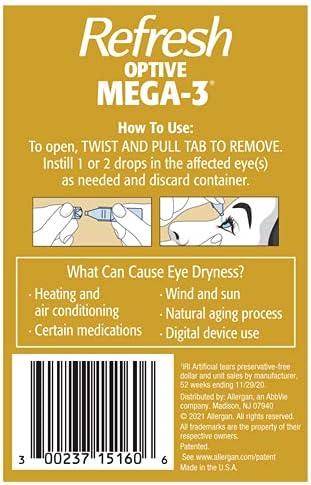 Our most advanced formula - Refresh optive Mega-3. Preservative-free, low blur formula fortifies and restores the lipid layer. Its unique blend of natural oils helps prevent tear evaporation. Treats Dry Eye signs and symptoms associated with Meibomian Gland Dysfunction (MGD). Nourishes all three layers of the tear film damaged by Dry Eye for immediate, long-lasting relief. This lipid-enhanced lubricant eye drop is clinically proven to treat the signs and symptoms of Dry Eye. Mega-3 does not require shaking prior to use, unlike Retaine MGD. Refresh optive Mega-3 Preservative-Free Lubricant Eye Drops come in sterile, single-use vials you can take with you anywhere and are safe to use as often as needed.