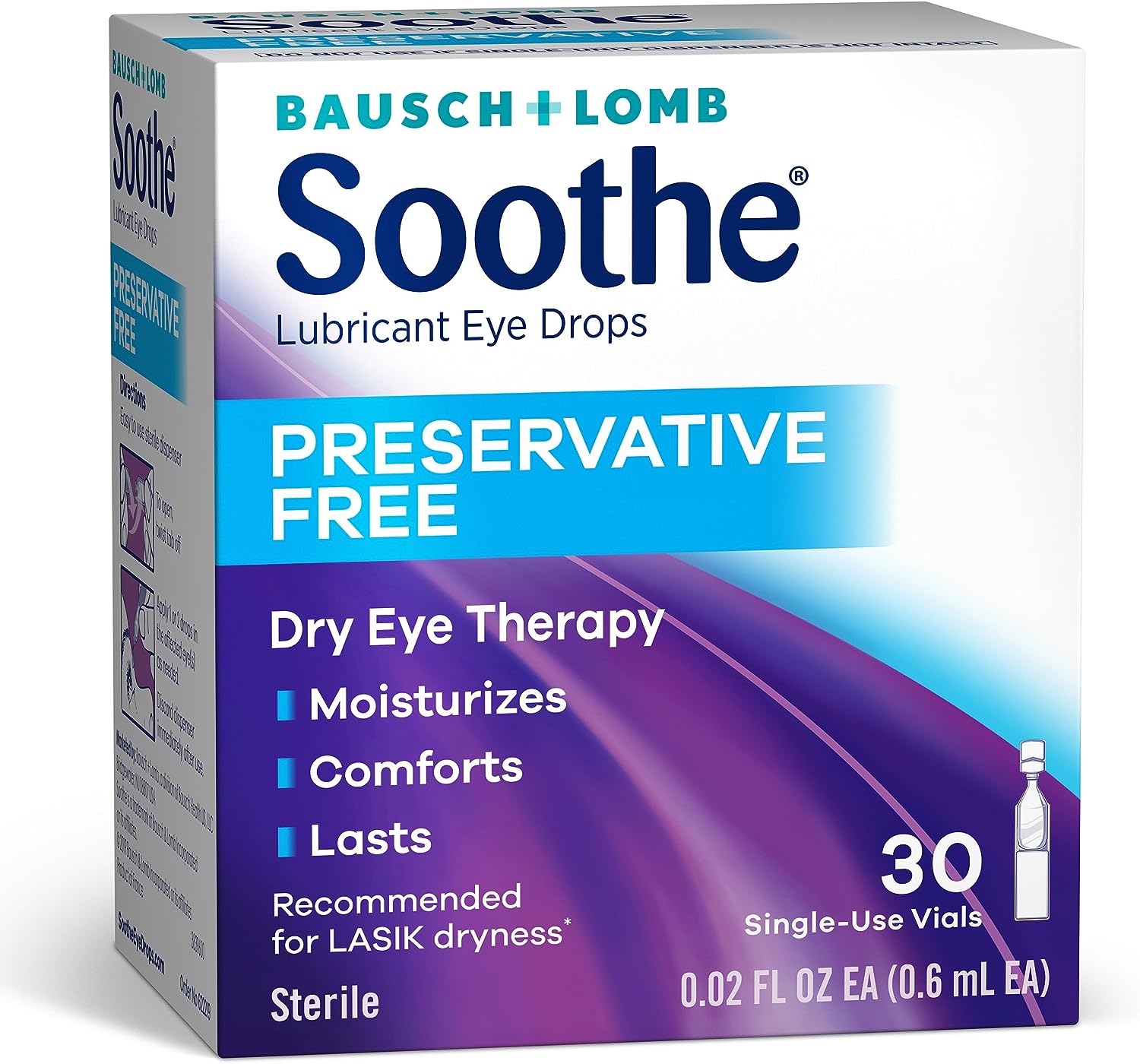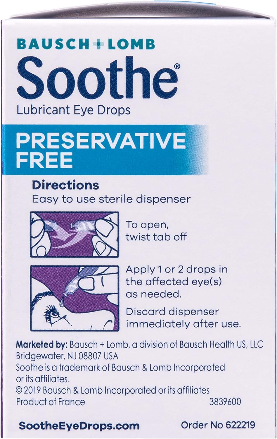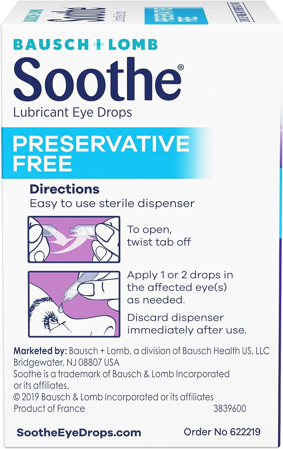 Soothe Preservative-Free Lubricant Eye Drops by Bausch + Lomb are designed to provide relief for those who suffer from dry eyes or experience dry, irritated eyes due to environmental factors such as air conditioning or computer use. Dry eye is an uncomfortable condition where your eyes stop making sufficient quantities of healthy tears, leading to a lack of moisture and lubrication. Fortunately, dry eye symptoms are treatable. Soothe dry eye therapy formula helps restore the moisture balance in your eyes, providing long-lasting hydration and soothing comfort. This product is sterile and free of preservatives, making it suitable for those who wear contact lenses. Soothe Preservative Free Lubricant Eye Drops are gentle enough for sensitive eyes and are recommended for LASIK dryness. These drops are easy to use and come in 30 single-use vials. Twist off the tab to open and instill 1 to 2 in the affected eye(s) as needed. Discard the single-use dispenser immediately after each use. Note: If used for post-operative (e.g. LASIK) dryness and discomfort, follow your eye doctor's instructions. Bausch + Lomb is a trusted and well-known brand in eye care, providing high-quality products for customers.