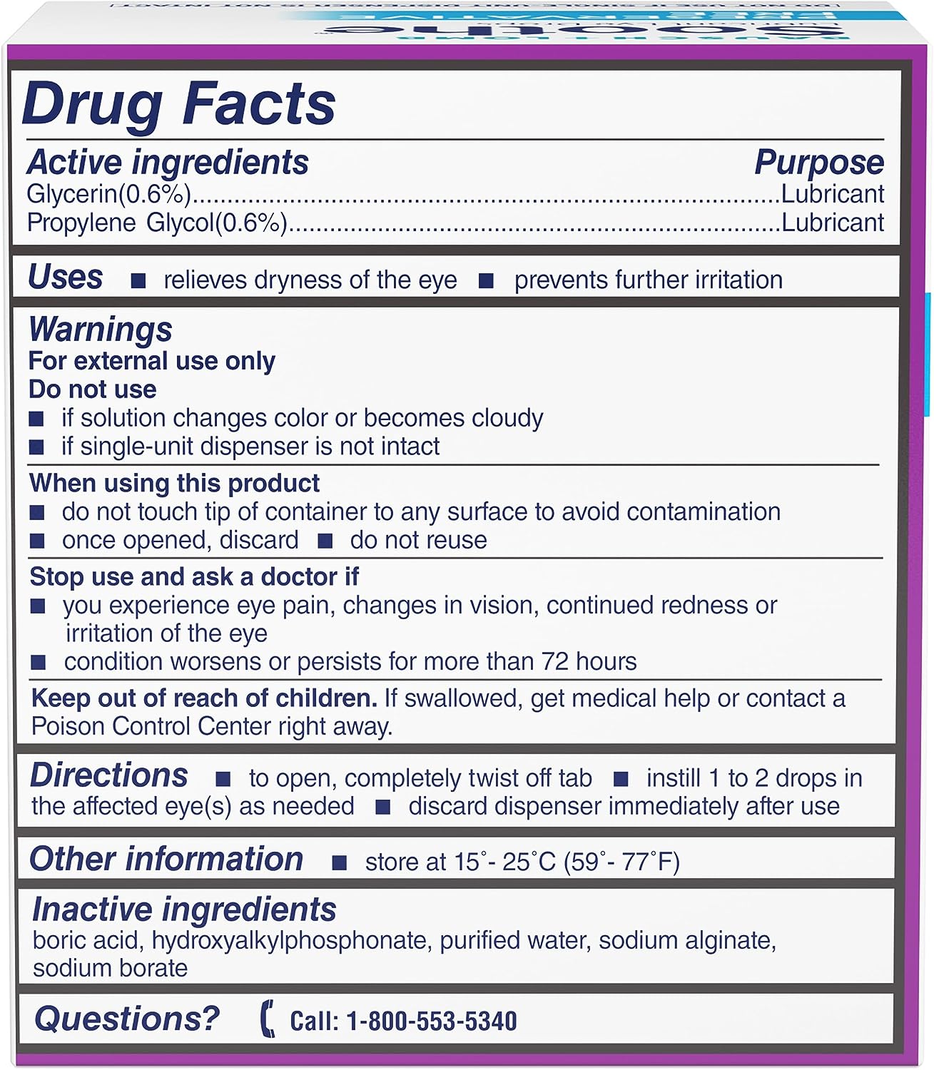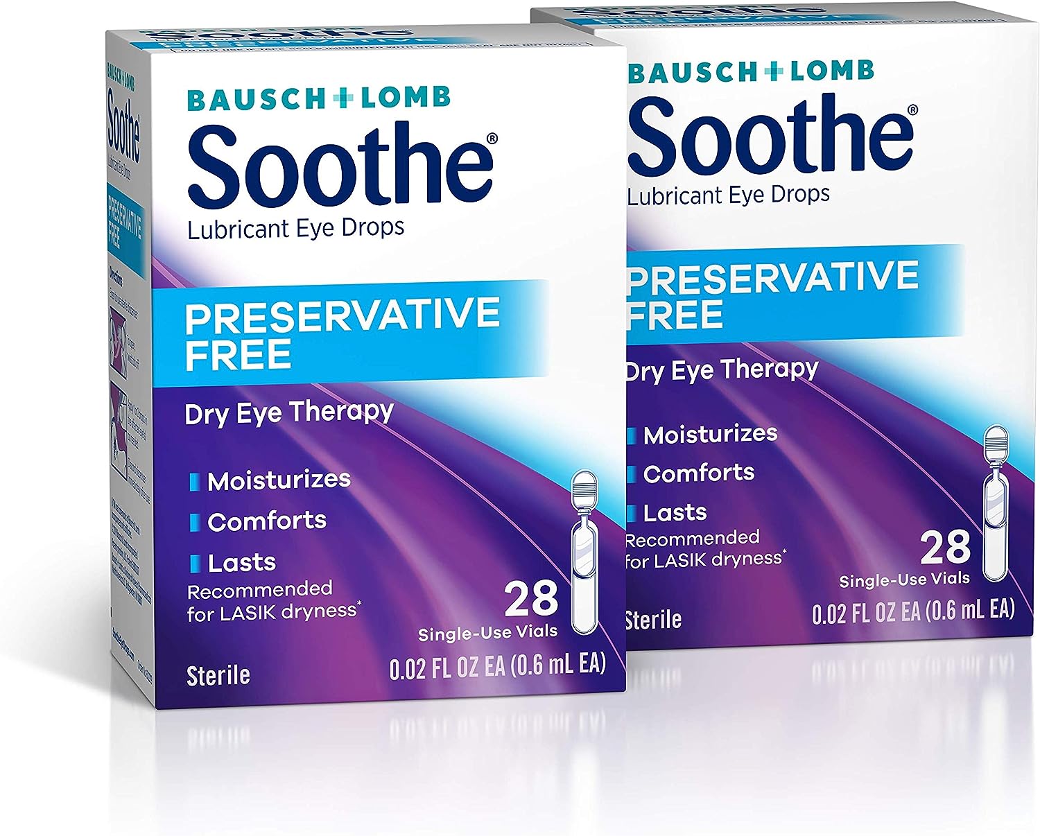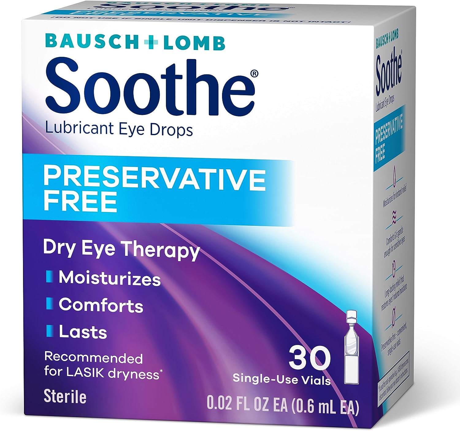 Soothe Preservative-Free Lubricant Eye Drops by Bausch + Lomb are designed to provide relief for those who suffer from dry eyes or experience dry, irritated eyes due to environmental factors such as air conditioning or computer use. Dry eye is an uncomfortable condition where your eyes stop making sufficient quantities of healthy tears, leading to a lack of moisture and lubrication. Fortunately, dry eye symptoms are treatable. Soothe dry eye therapy formula helps restore the moisture balance in your eyes, providing long-lasting hydration and soothing comfort. This product is sterile and free of preservatives, making it suitable for those who wear contact lenses. Soothe Preservative Free Lubricant Eye Drops are gentle enough for sensitive eyes and are recommended for LASIK dryness. These drops are easy to use and come in 30 single-use vials. Twist off the tab to open and instill 1 to 2 in the affected eye(s) as needed. Discard the single-use dispenser immediately after each use. Note: If used for post-operative (e.g. LASIK) dryness and discomfort, follow your eye doctor's instructions. Bausch + Lomb is a trusted and well-known brand in eye care, providing high-quality products for customers.
