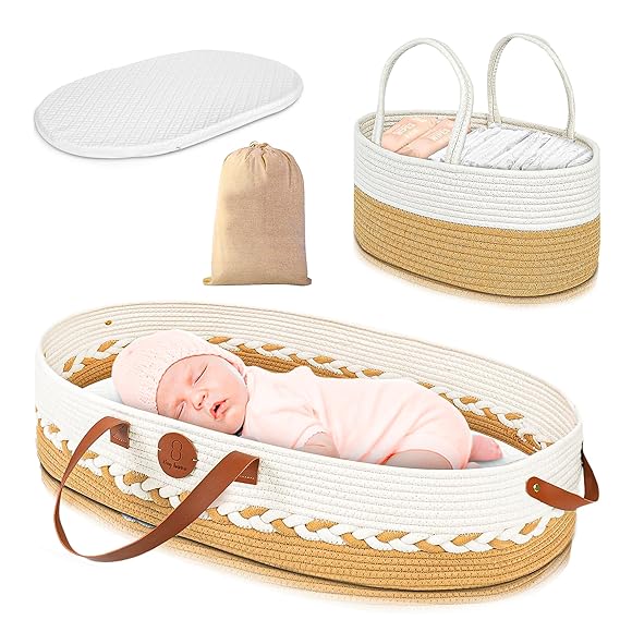 Moses Basket for Newborn, Foam Pad Changing Basket with Waterproof Cover, Baby Changing Basket with Diaper Caddy, Cloth Tote Bag for Traveling with The Set, Portable Boho Set
