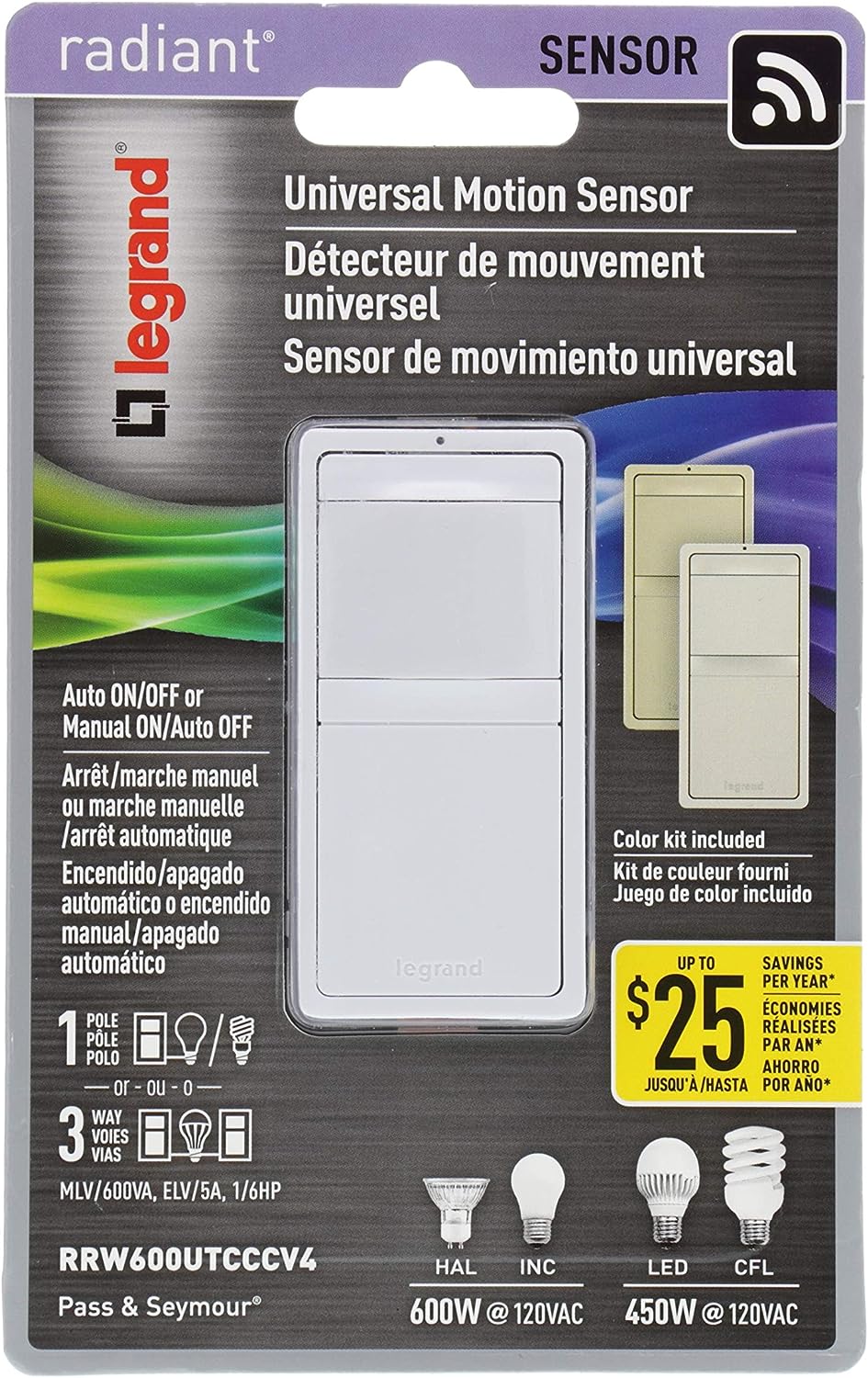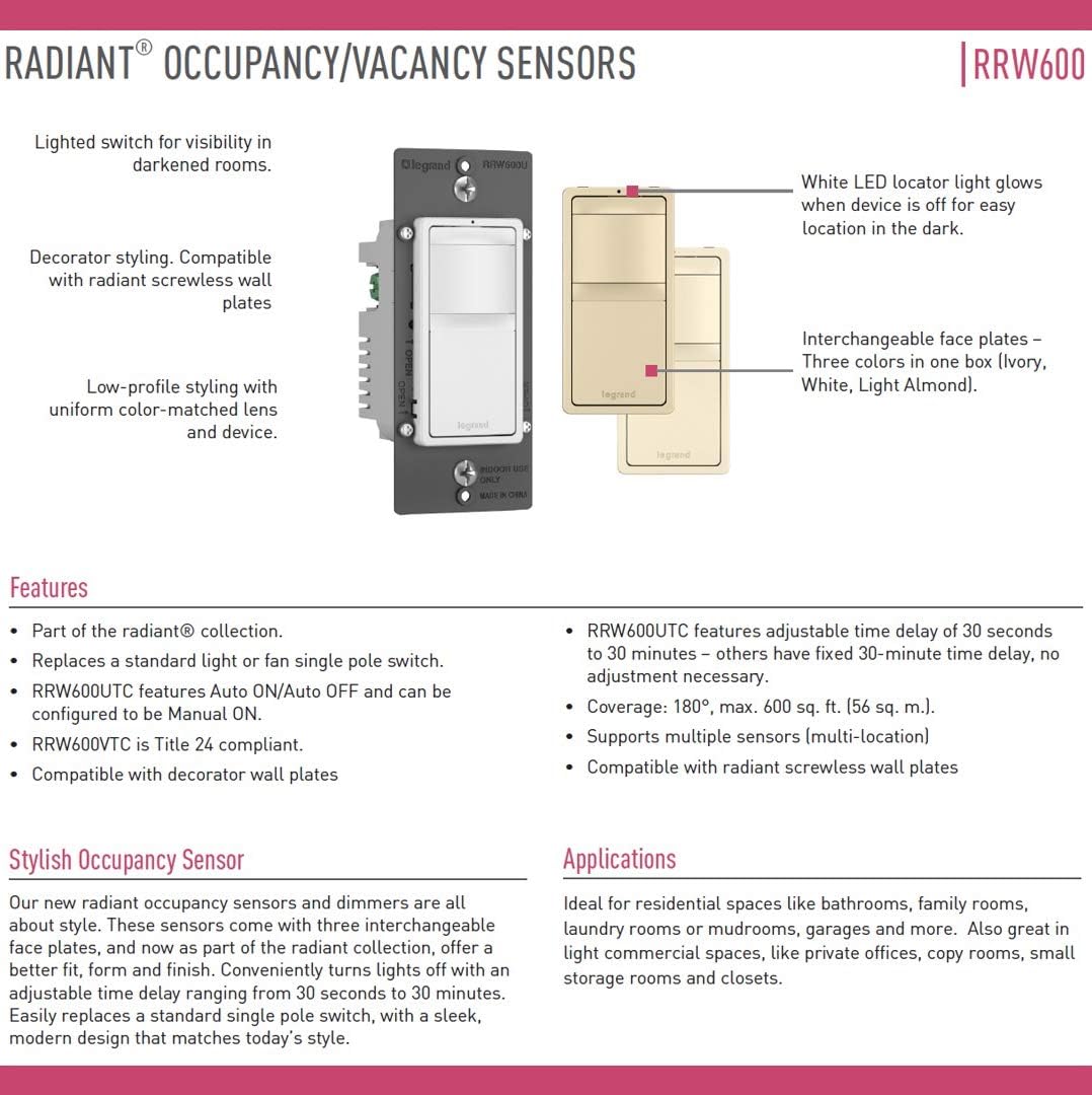 Replace any standard single pole light switch with radiant sensors, ideal for saving energy in high traffic areas of your home like bedrooms and baths. Includes three interchangeable face covers in White, Ivory and Light Almond.