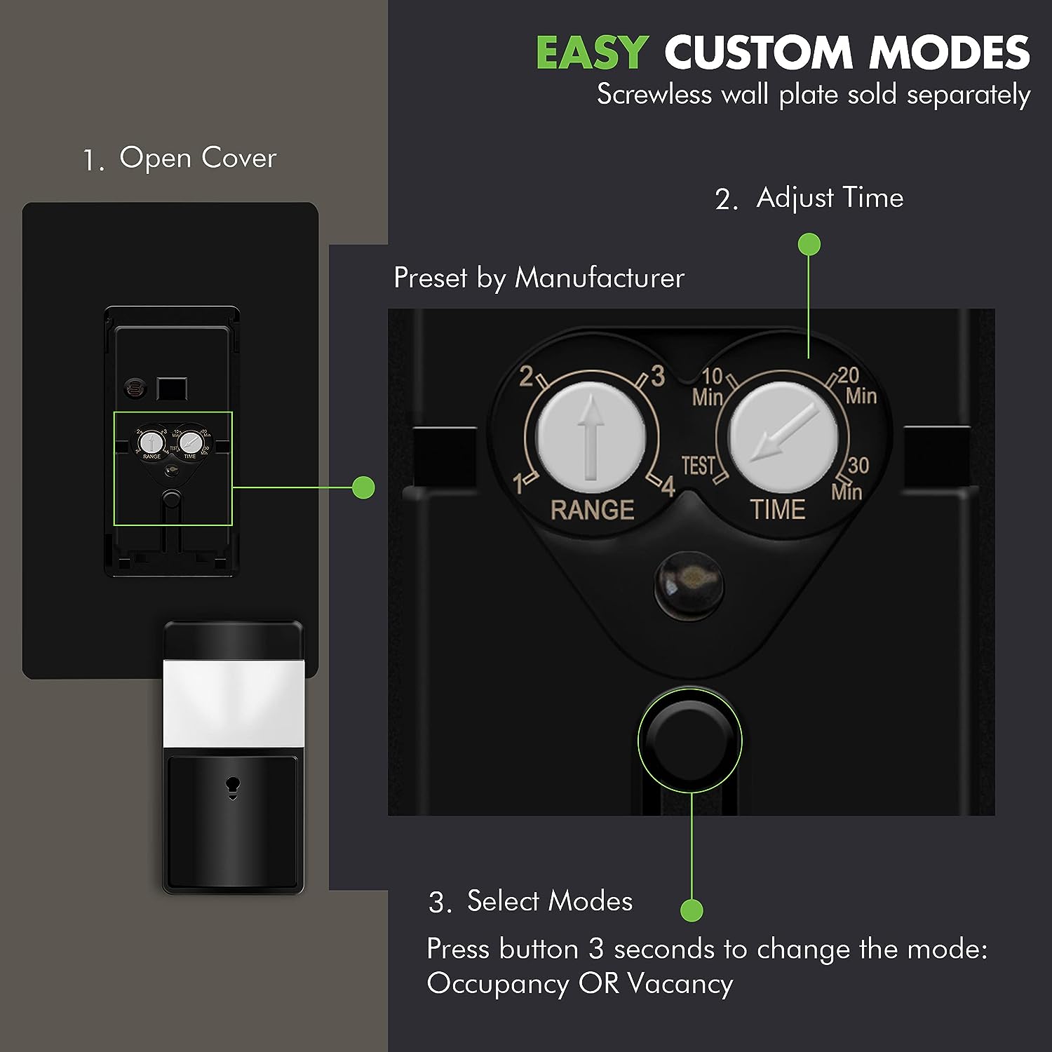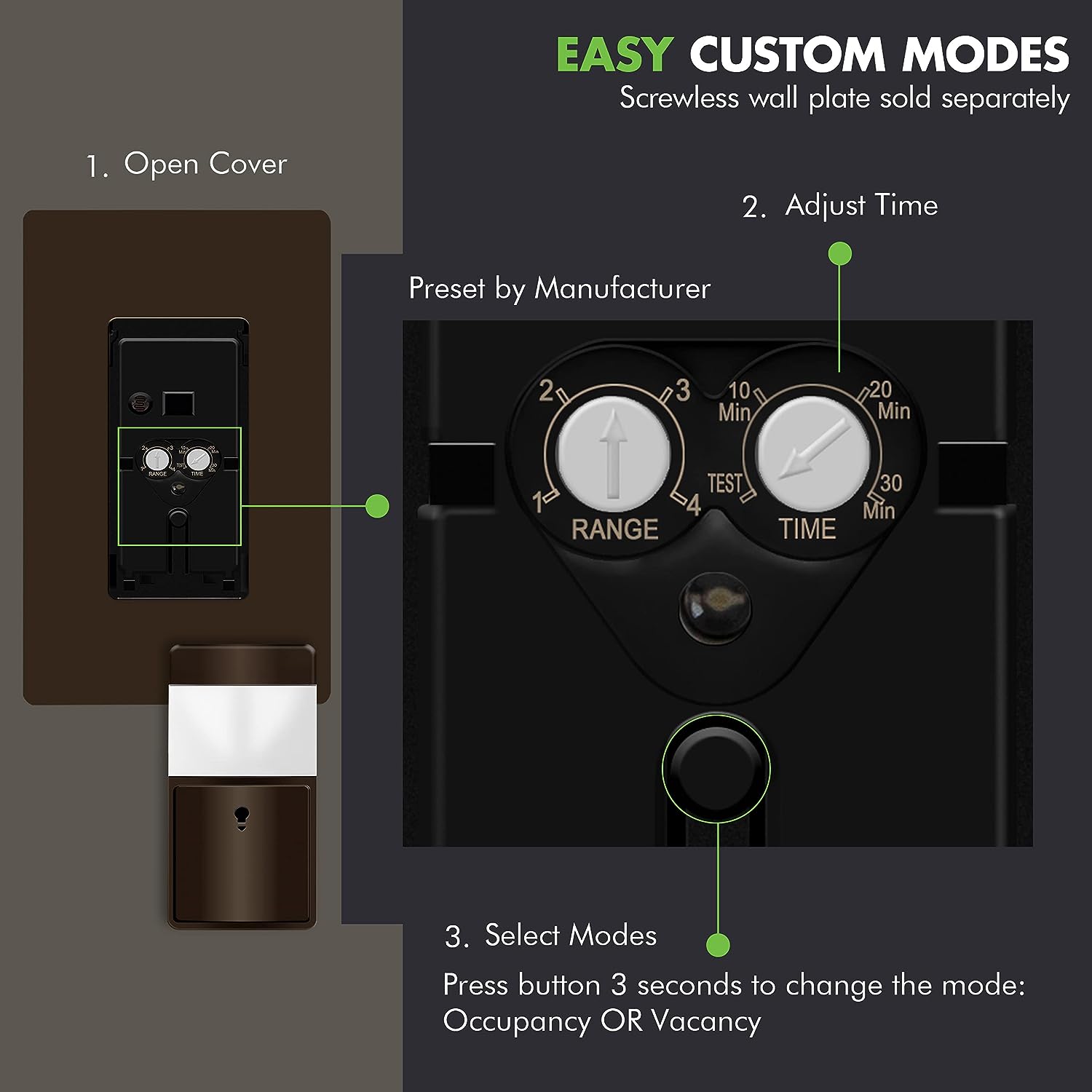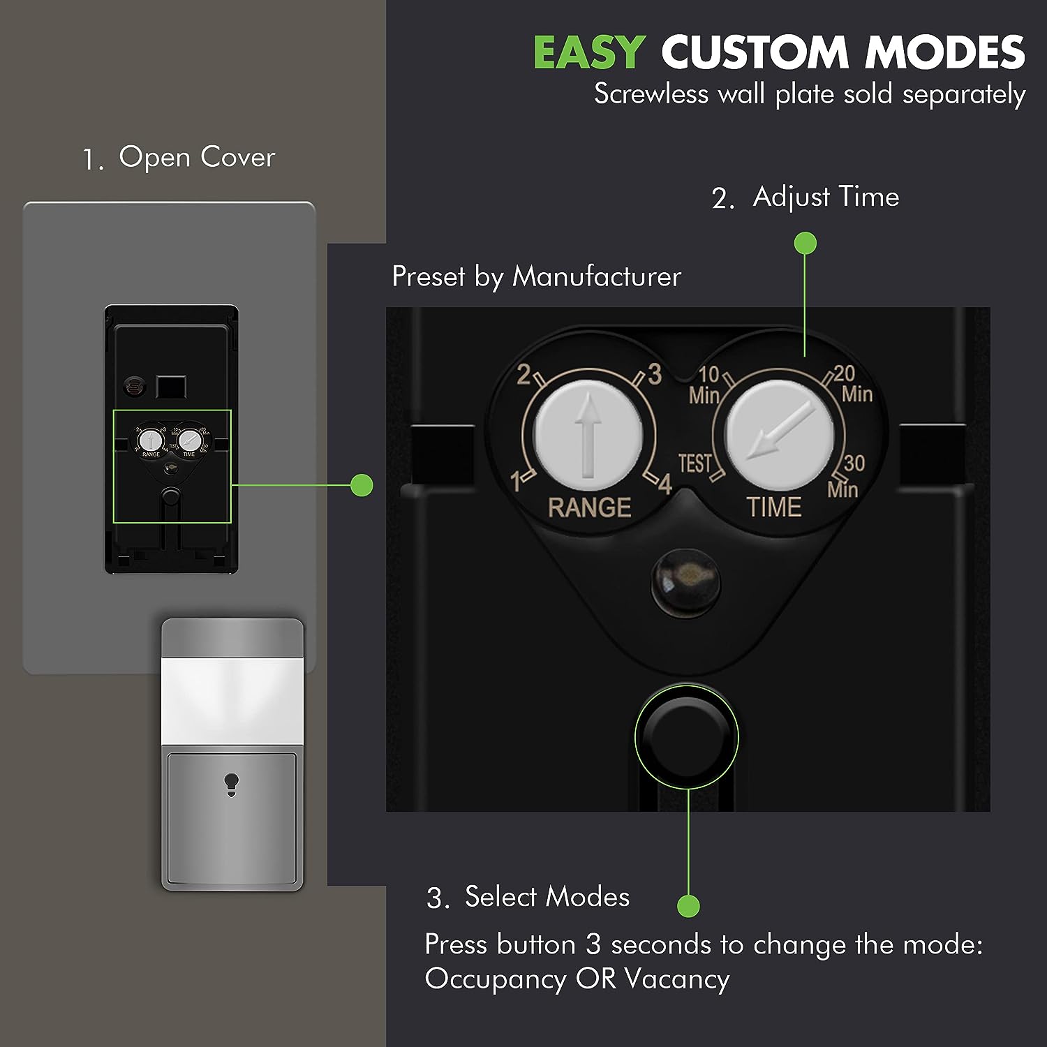 • Occupancy sensor mode (Auto ON, Auto OFF) and vacancy sensor mode (Manual ON, Auto OFF) allow you to customize the sensor according to your needs; adjustable time delay options: 15 sec (Test), 5 min, 10 min, 20 min, 30 min