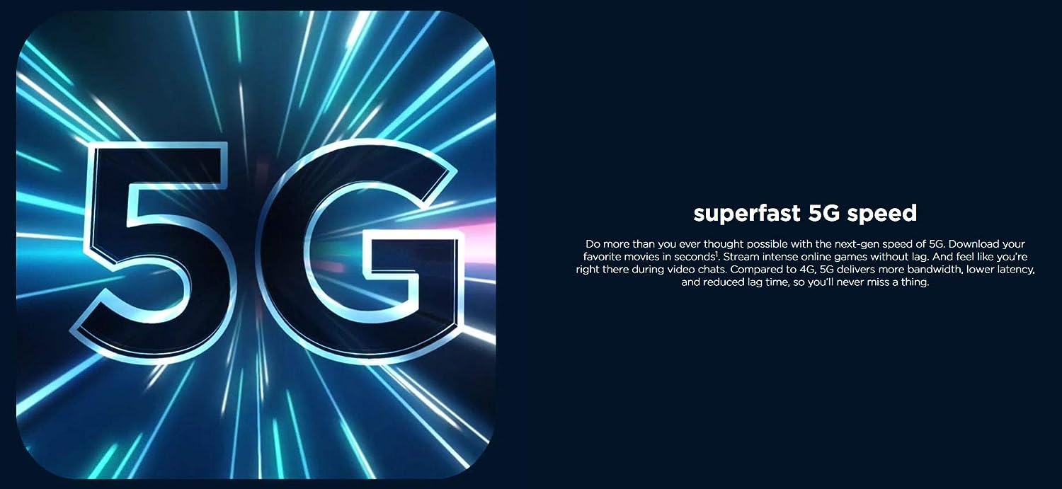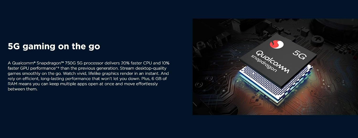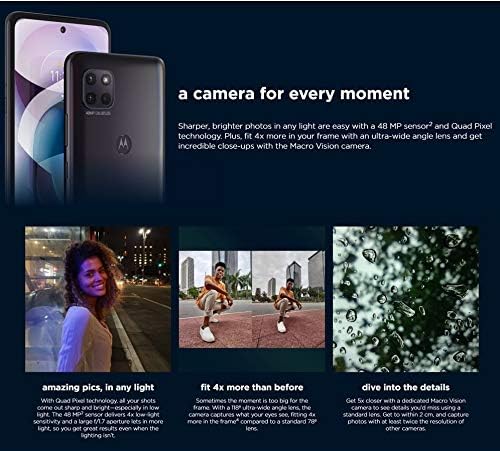 superfast 5G speed: Do more than you ever thought possible with the next-gen speed of 5G. Download your favorite movies in seconds. Stream intense online games without lag. And feel like you’re right there during video chats. Compared to 4G, 5G delivers more bandwidth, lower latency, and reduced lag time, so you’ll never miss a thing. over 2 days of power: Work, play, and get more done in your day with a 5000 mAh battery that keeps you going strong for more than 2 days. Need a quick boost? TurboPower 20 charging gives you 10 hours of power in just 15 minutes, so you’re ready for anything. a camera for every moment: Sharper, brighter photos in any light are easy with a 48 MP sensor and Quad Pixel technology. Plus, fit 4x more in your frame with an ultra-wide angle lens and get incredible close-ups with the Macro Vision camera. 5G gaming on the go: A Qualcomm Snapdragon 750G 5G processor delivers 20% faster CPU and 10% faster GPU performance than the previous generation. Stream desktop-quality games smoothly on the go. Watch vivid, lifelike graphics render in an instant. And rely on efficient, long-lasting performance that won’t let you down. Plus, 6 GB of RAM means you can keep multiple apps open at once and move effortlessly between them. water repellent. worry proof: Never let spills or splashes get in your way. Whether you’re going for a run or taking a call in the rain, a water-repellent design6 keeps your phone protected inside and out.