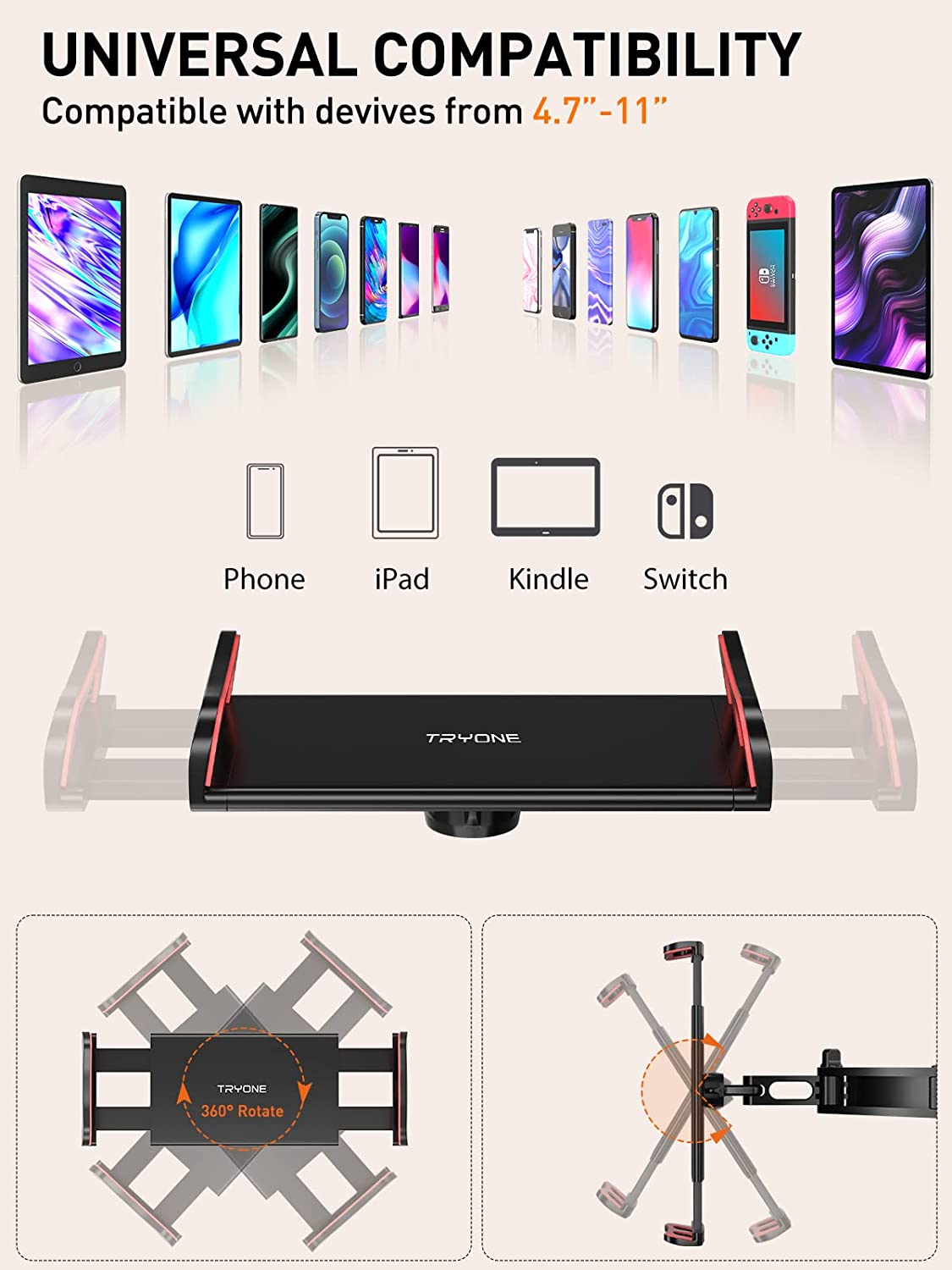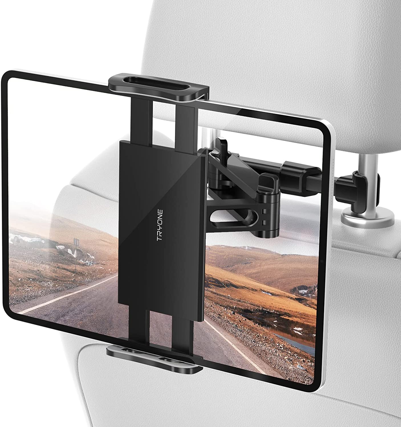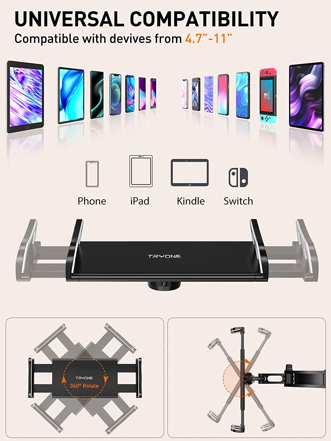 Tryone Car Headrest Tablet Mount Holder Stretchable Backseat Tablets Stand for Kids Compatible with iPad Air Mini/Cell Phone/Galaxy Tab/Kindle Fire Hd/Switch Lite or Other 4.7-10.5" Device