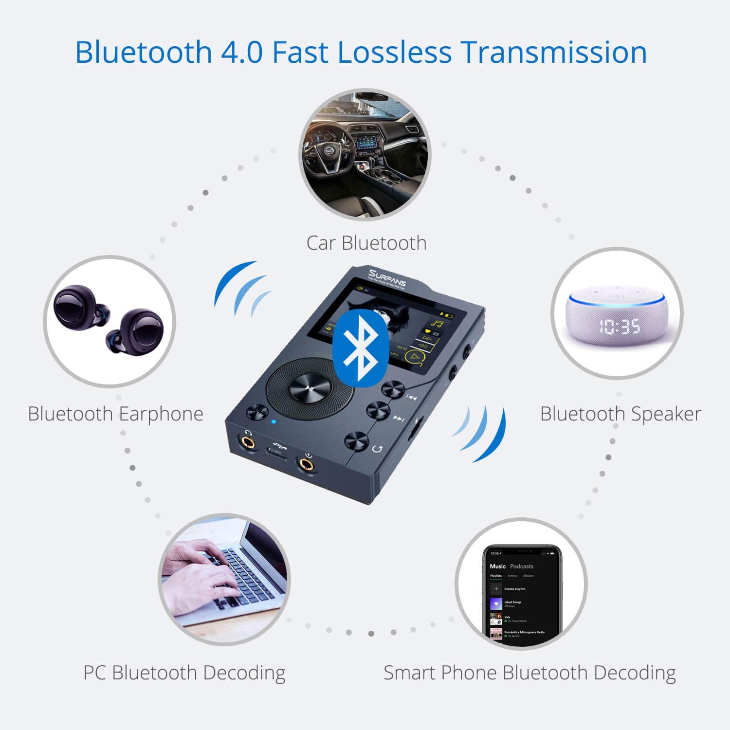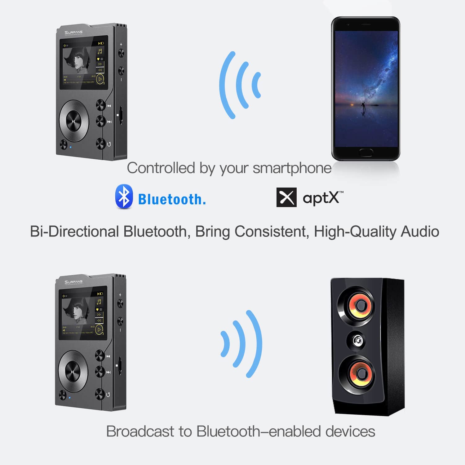 • 【Bi-directional Bluetooth 】: This high res audio player features of Bluetooth V4.0 of for communication that will change your life, double-way lossless wireless bluetooth transmission with APT-X protocol. Music player can broadcast to bluetooth-enabled devices such headphone, speaker etc; and also can be a Bluetooth receiver