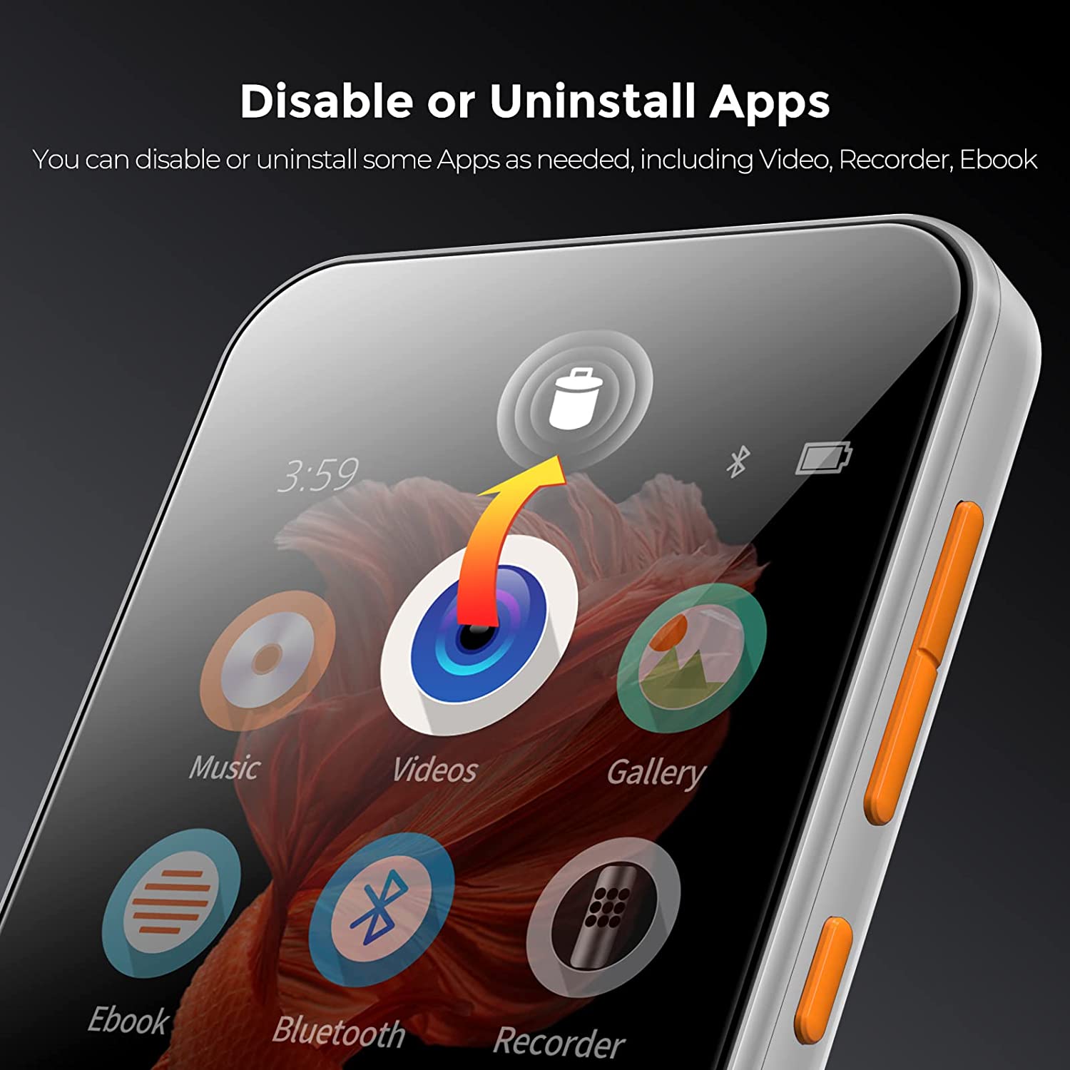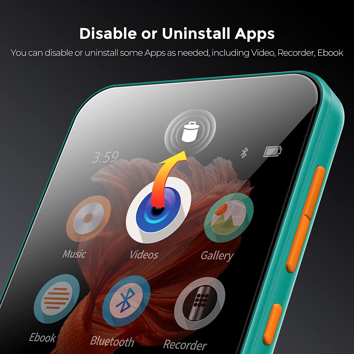 • 【Disable / Uninstall Apps】-- Q3E Bluetooth music player allows you to disable or uninstall some Apps on the device, including Videos, Ebook, Recorder, to meet your personalized needs. Especially for children, primary and secondary school students, etc.