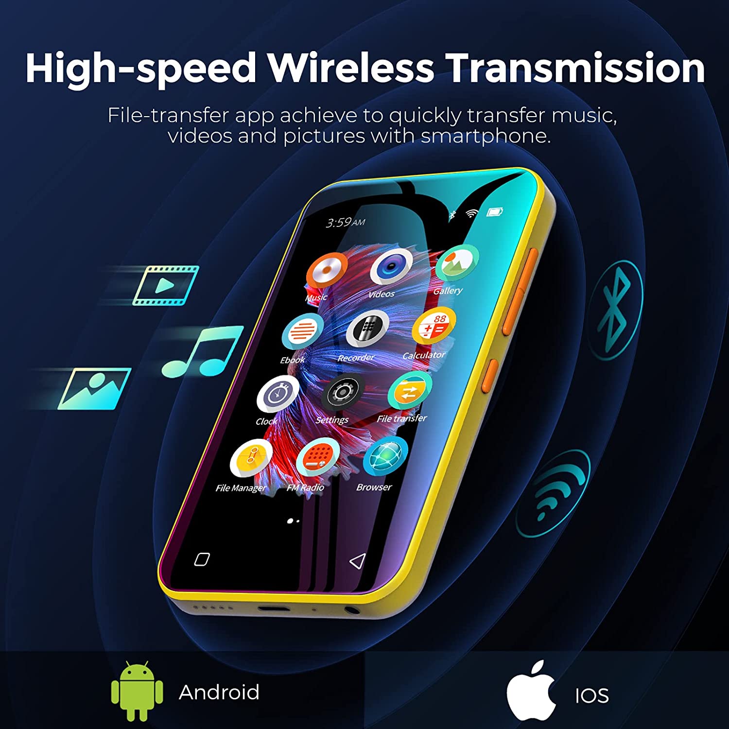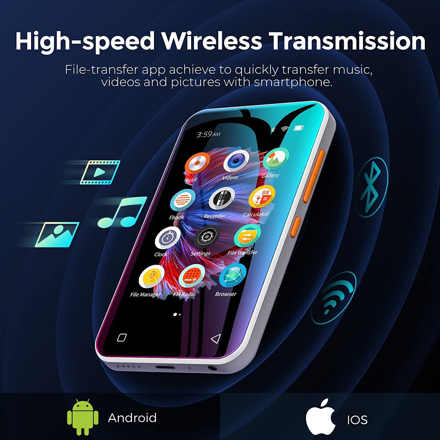 • 【High-speed Wireless Upload】-- Different from most current mp3 players, Q5 wifi mp3 player not only provides USB cables to upload music and videos, but also can share or transfer files via Bluetooth and WiFi. With the provided File transfer App, you can easily transfer files between the smartphone and the player, especially for Android devices.