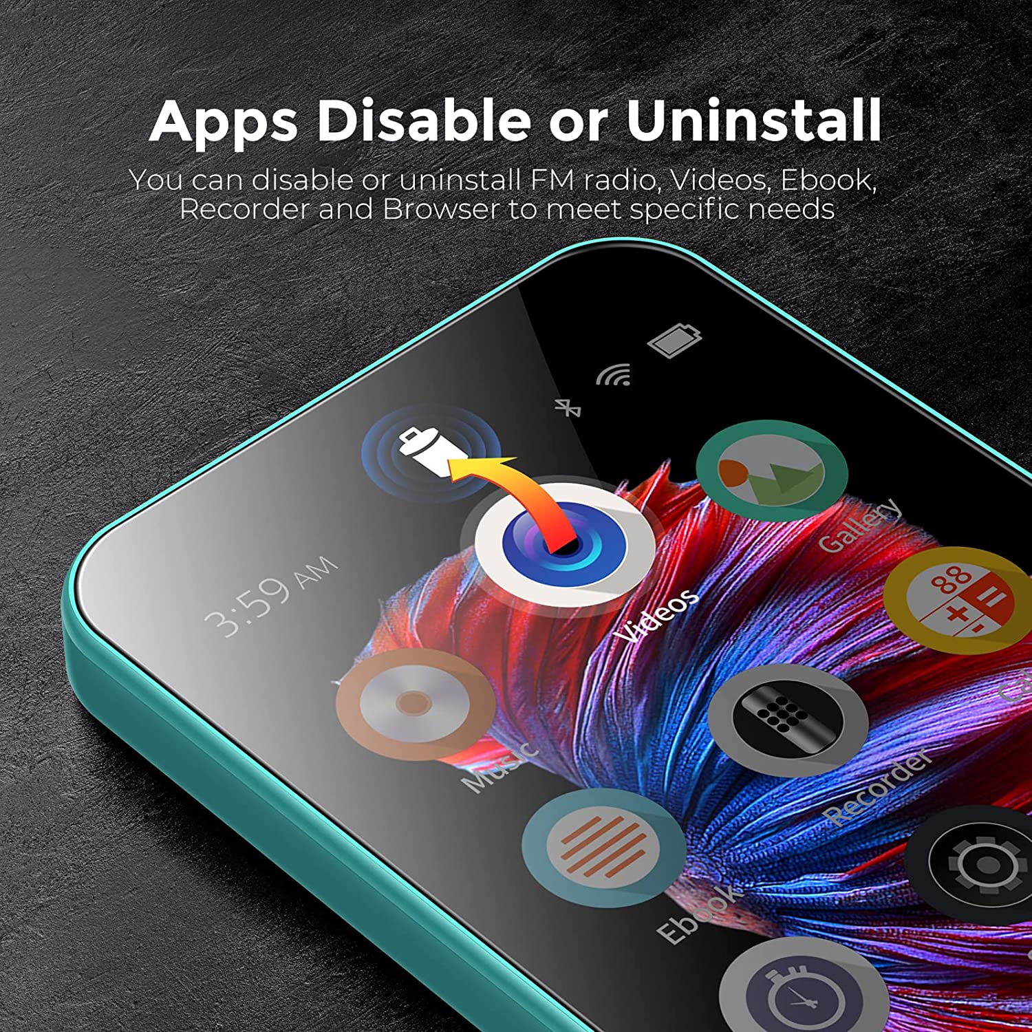• 【Disabled / Uninstall Apps】 -- TIMMKOO Q5 digital music player allows you to disable or uninstall some Apps on the device, including FM Radio, Videos, Ebook, Browser, Recorder, to meet your personalized needs. Especially for children, elementary and middle school students, etc