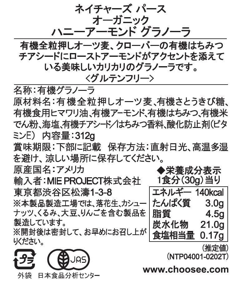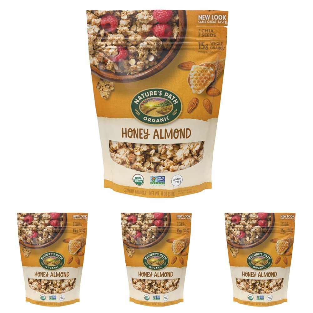 Looking for a healthy, gluten free breakfast that'll make your taste buds buzz? Look no further than our flavorful Nature's Path Honey Almond Granola. You'll fall in love with the exciting combo of crunchy Californian almonds and chia seeds mixed with crispy whole grain oat clusters, all sweetened with organic clover honey, providing 28g of whole grains, 4g of fiber, 5g of plant protein. Enjoy it as a wholesome breakfast or as an on-the-go snack thanks to the convenient resealable zip top pouch, and take comfort in the knowledge that you're eating well in the morning, during the day, or in the evening (sneaky Midnight snack, anyone?). At Nature's Path we hold organic to an even higher standard: to build and regenerate the soil. As pioneers of the organic movement, we believe organic food and farming is the best way to care for our bodies and for the planet. We always have and always will use our voice to stand for what we believe is right, and what organic truly means.