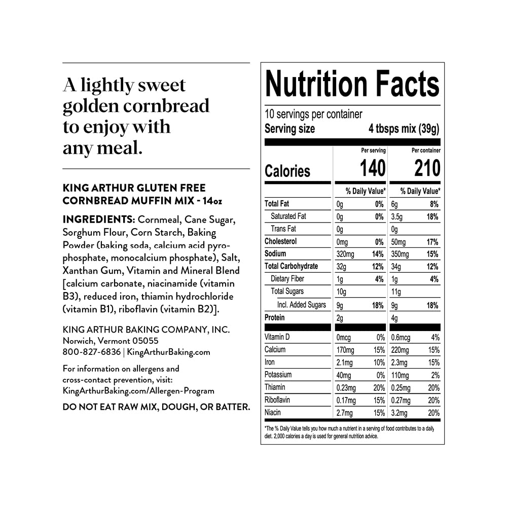 King arthur flour cornbread mix is our uncompromising solution to gluten-Free baking. Our baking mix is completely kosher and, of course, certified gluten-Free. Additionally, our baking mix contains no artificial preservatives and is non-Gmo. The king arthur flour company has been baking with joy since 1970. We love what we do, and it shows through our products. Included is one 14 oz. Bag of king arthur flour cornbread mix.