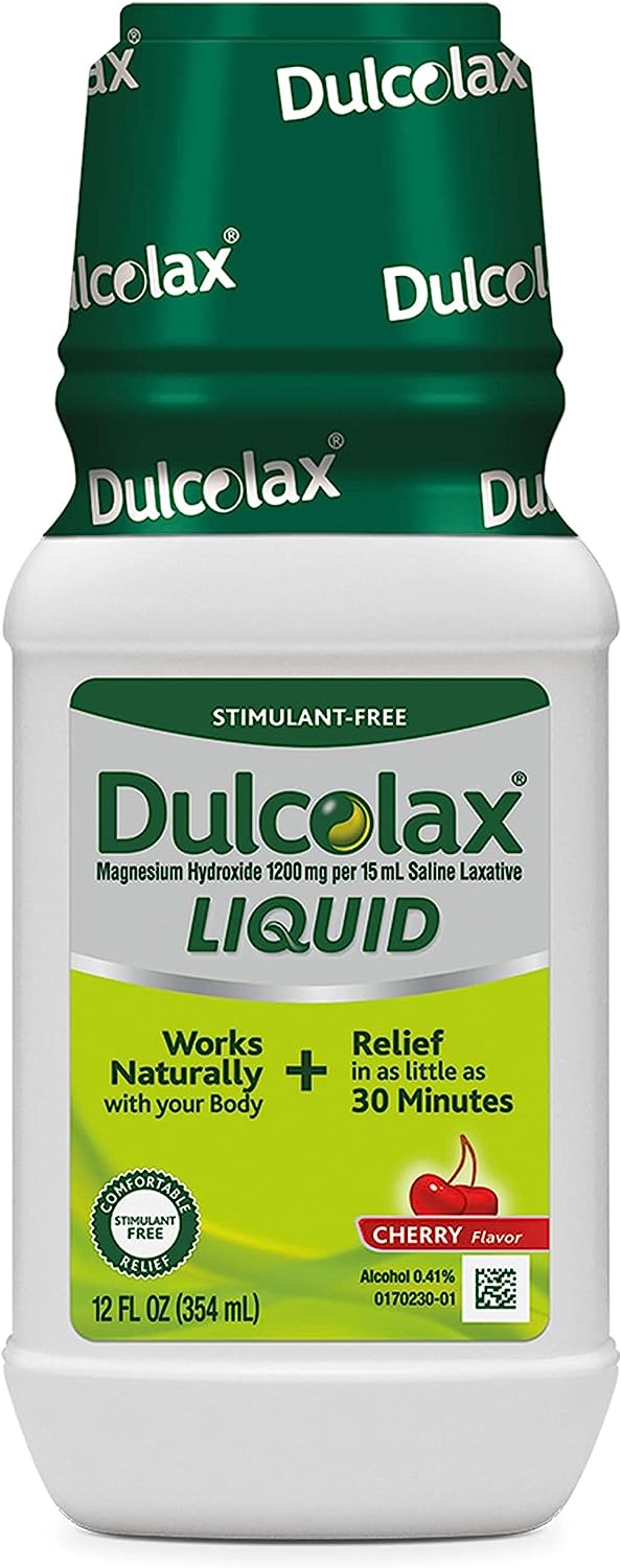 Experience fast relief from occasional constipation and irregularity in a cherry-flavored liquid with Dulcolax Liquid Laxative. Formulated with active ingredient magnesium hydroxide, this gentle laxative works naturally with your body to draw water into the colon to help soften hard, dry stools. Best of all, Dulcolax Cherry Liquid gives you relief in as little as 30 minutes*. How's that for fast* and effective? Dulcolax Liquid Laxative also comes in mint flavor. DIRECTIONS: Shake well immediately before each use; for accurate dosing, use convenient pre-measured dose cup; drink a full glass (8 oz) of liquid with each dose; dose may be taken as a single daily dose or in divided doses; do not exceed the maximum recommended daily dose in a 24-hour period. See packaging for dosing information. *Works in 30 minutes to 6 hours.