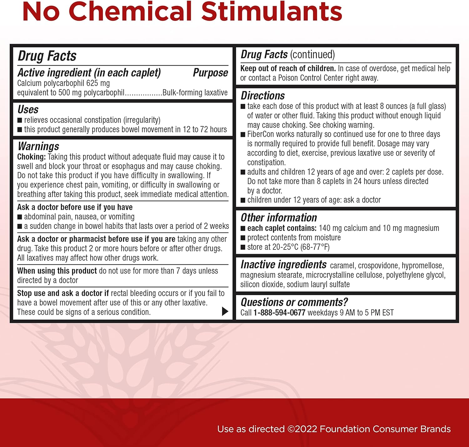 Since 1987, people have chosen FiberCon as the simple, safe, and comfortable fiber therapy option to help relieve constipation. FiberCon is just as effective as fiber powders for regaining bowel irregularity but provides a more convenient choice in easy-to-swallow coated caplets. FiberCon is 100% insoluble fiber that provides constipation relief by simply drawing water into the stool. FiberCon is safe and effective for adults and children 12 years or older and generally produces a bowel movement in 12-72 hours, and since the insoluble fiber in FiberCon does not ferment it will not cause uncomfortable intestinal gas or bloating. Trust FiberCon as your convenient and comfortable option to relieve occasional constipation and feel like yourself again!