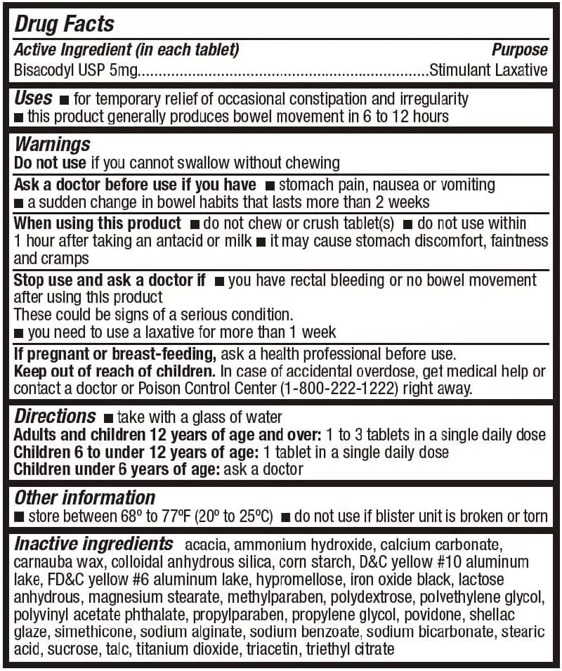 • The active ingredient is Bisacodyl 5mg which is a stimulant laxative.