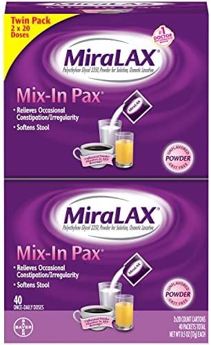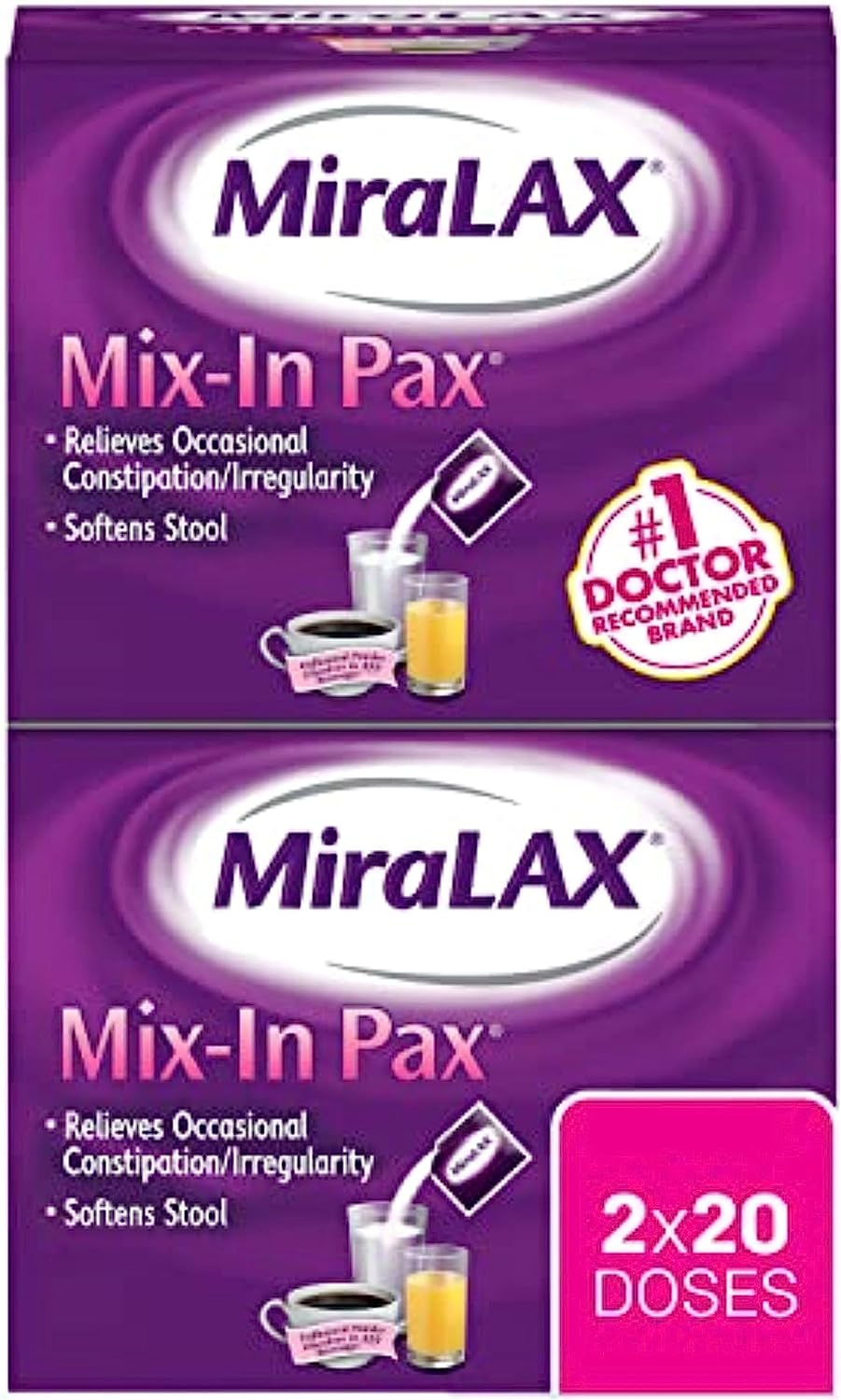 MiraLAX Gentle Constipation Relief Laxative Powder, Stool Softener with PEG 3350, No Harsh Side Effects, #1 Physician Recommended, Single Dose Mix-In Pax, Travel Pack, 40 Dose