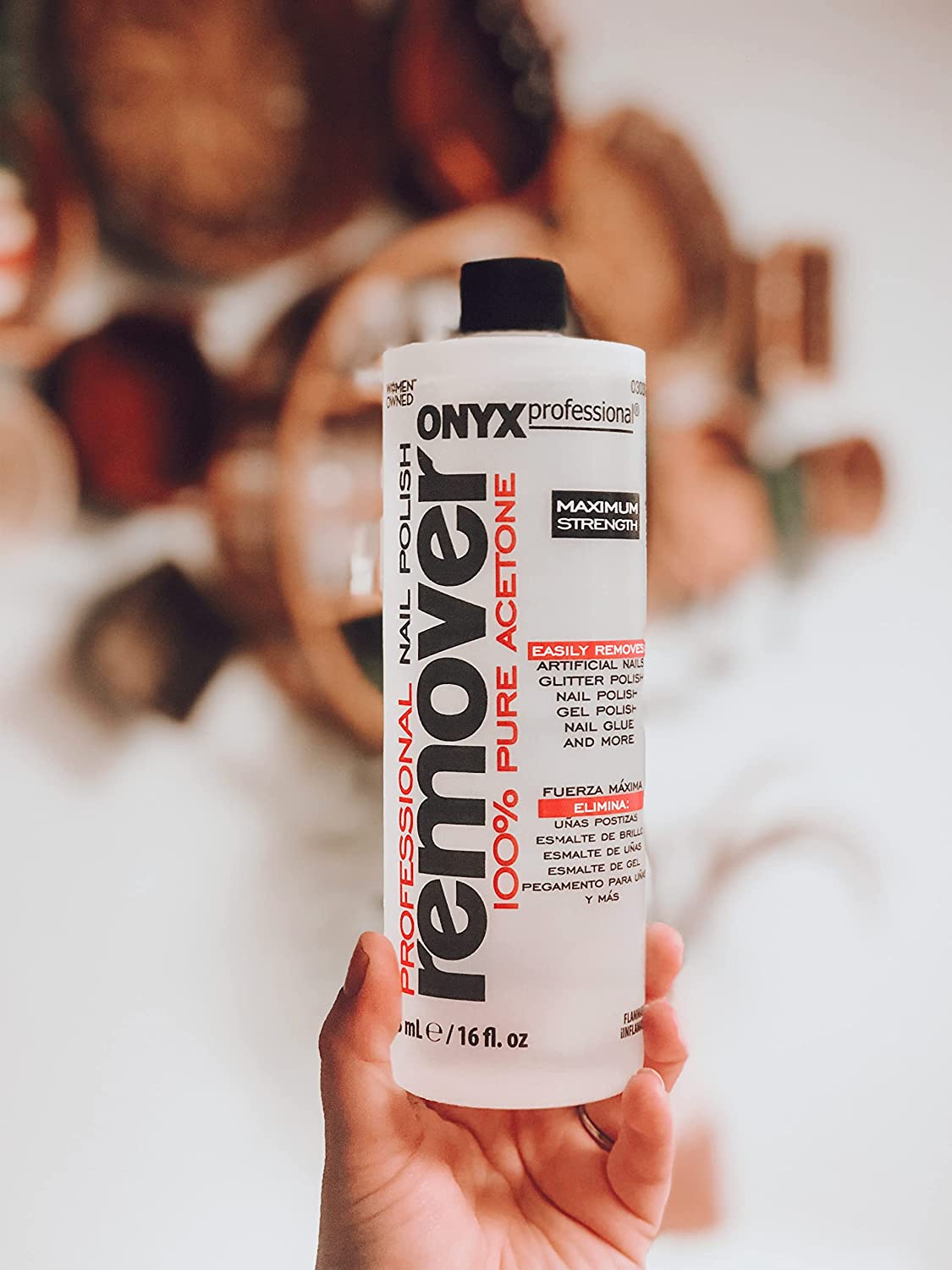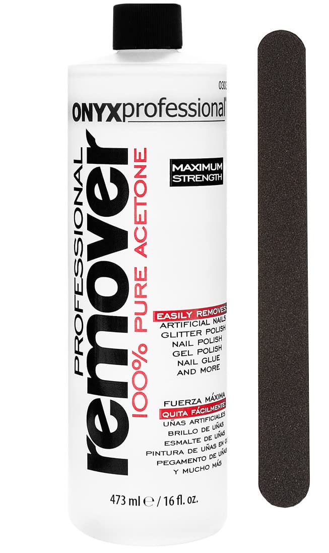 Onyx Professional 100% acetone nail polish remover works on all nail polishes. It is professional strength and comes in a 16oz bottle. Made in the USA