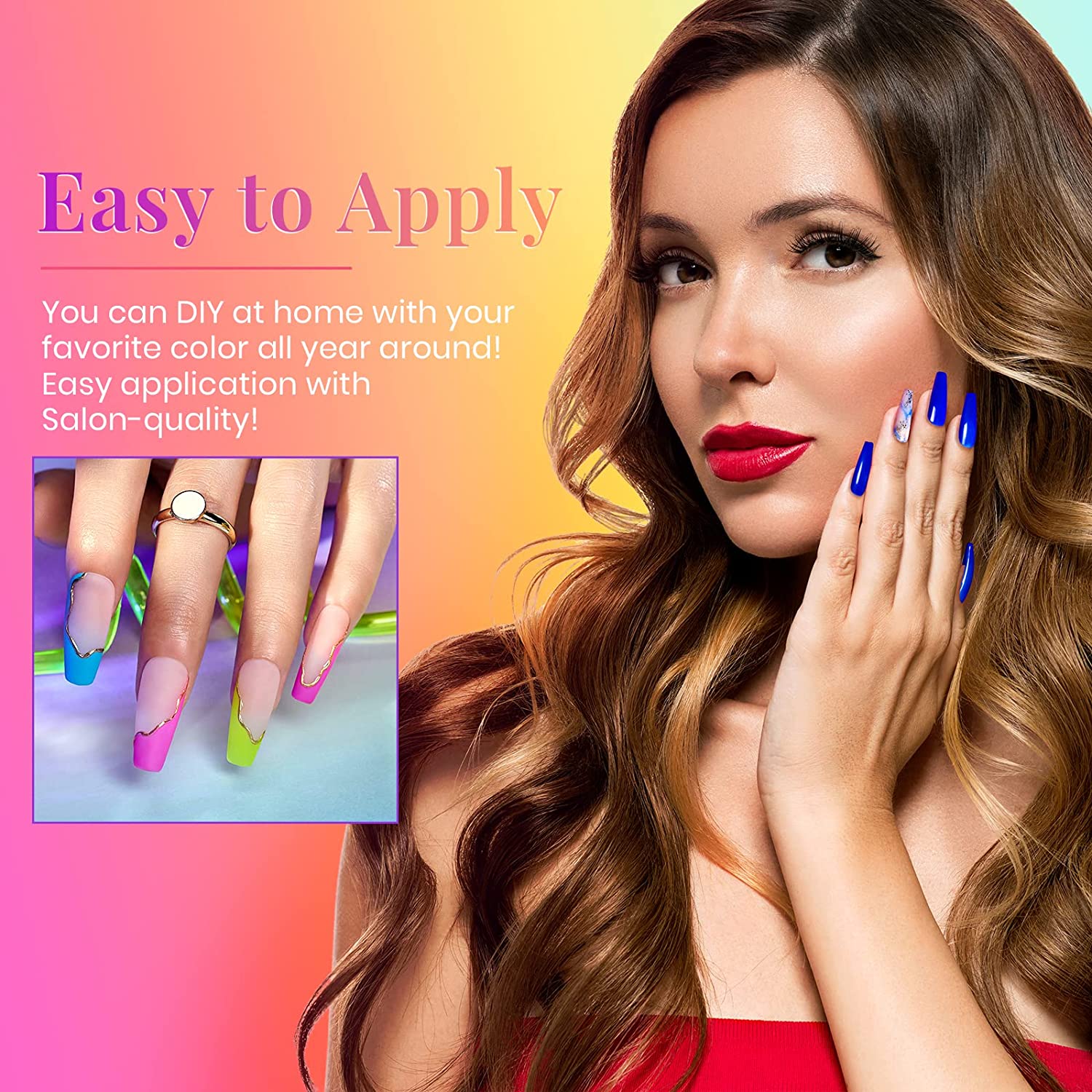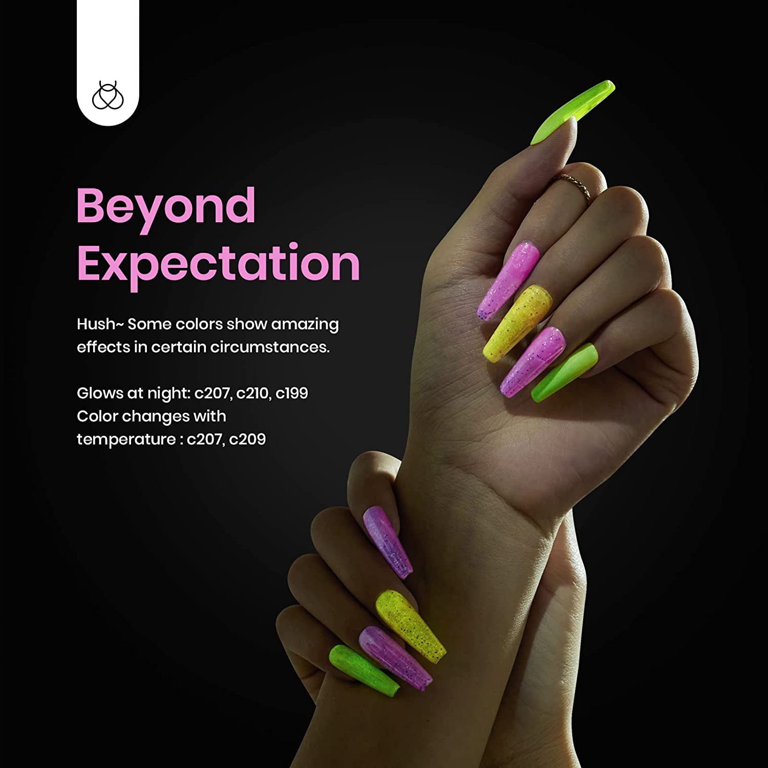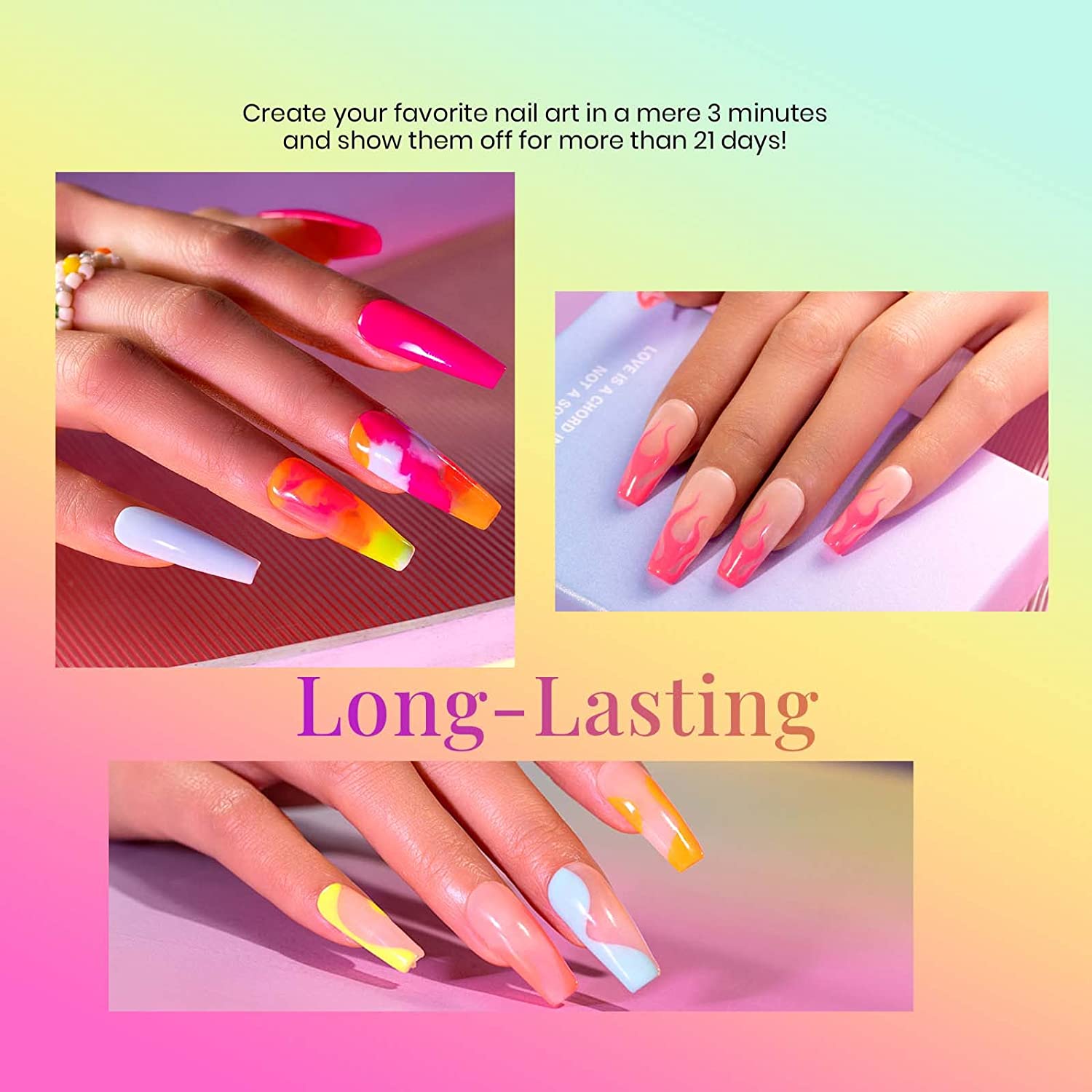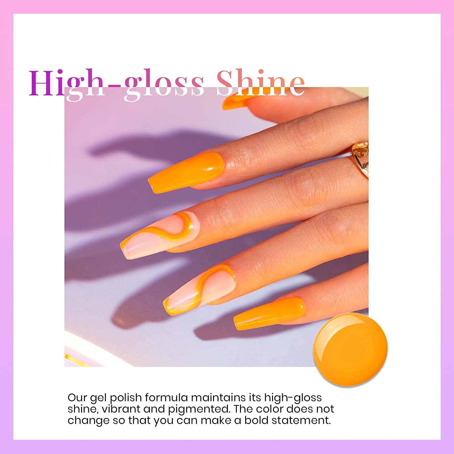 • Soak off LED Gel Nail Polish: Neon gel nail polish kit Neon yellow Pink Orange Pastel Baby Blue Sparkle gel polish needs to be cured under LED nail lamp. Base and Top coat required. Average for LED light 60-120 secs, nail dryer 2-4 mins.