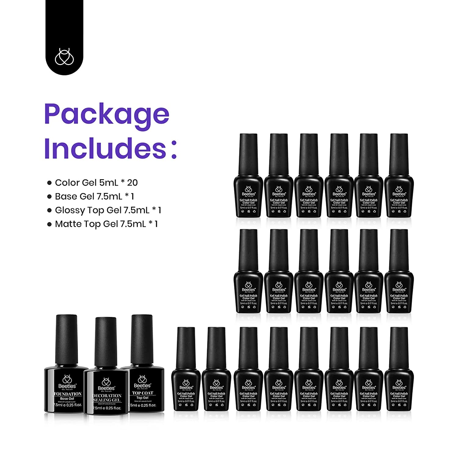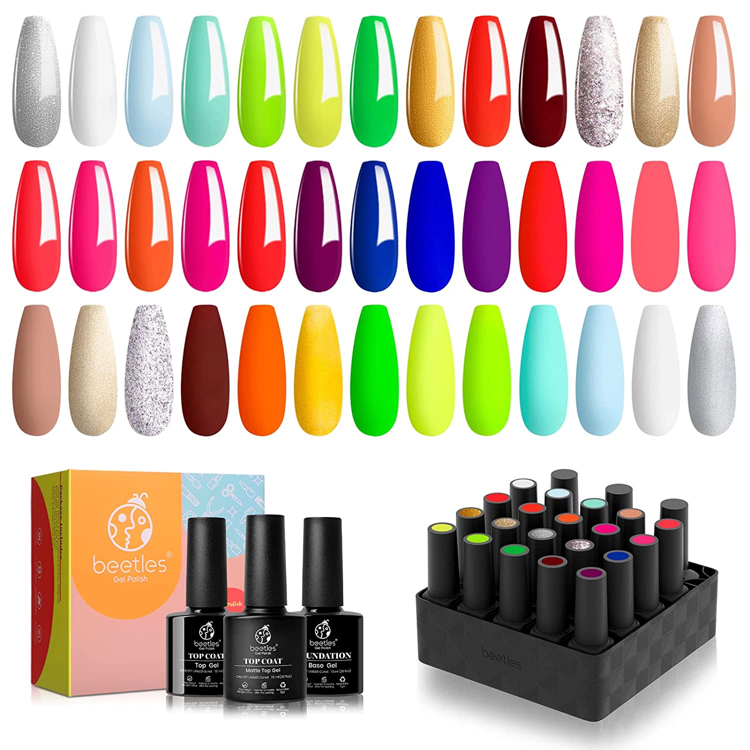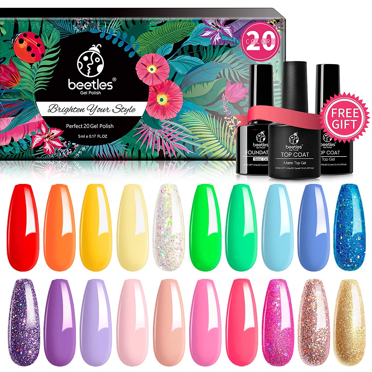 beetles Gel Polish Nail Set 20 Colors Neon Collection Hot Pink Magenta Lemon Green Soak Off Manicure Starter Kit with 3 Pcs Matte and Glossy Top Coat Base