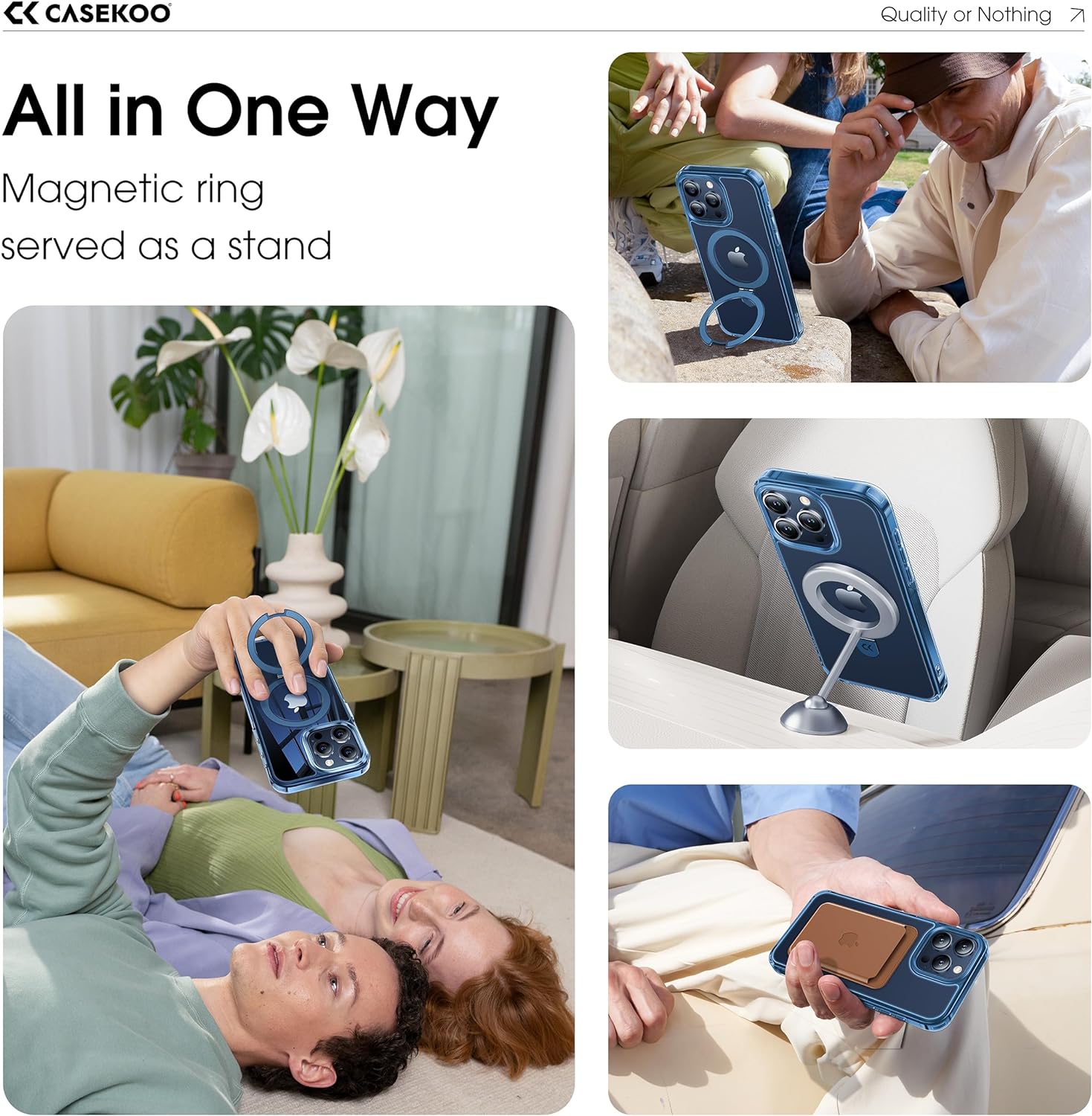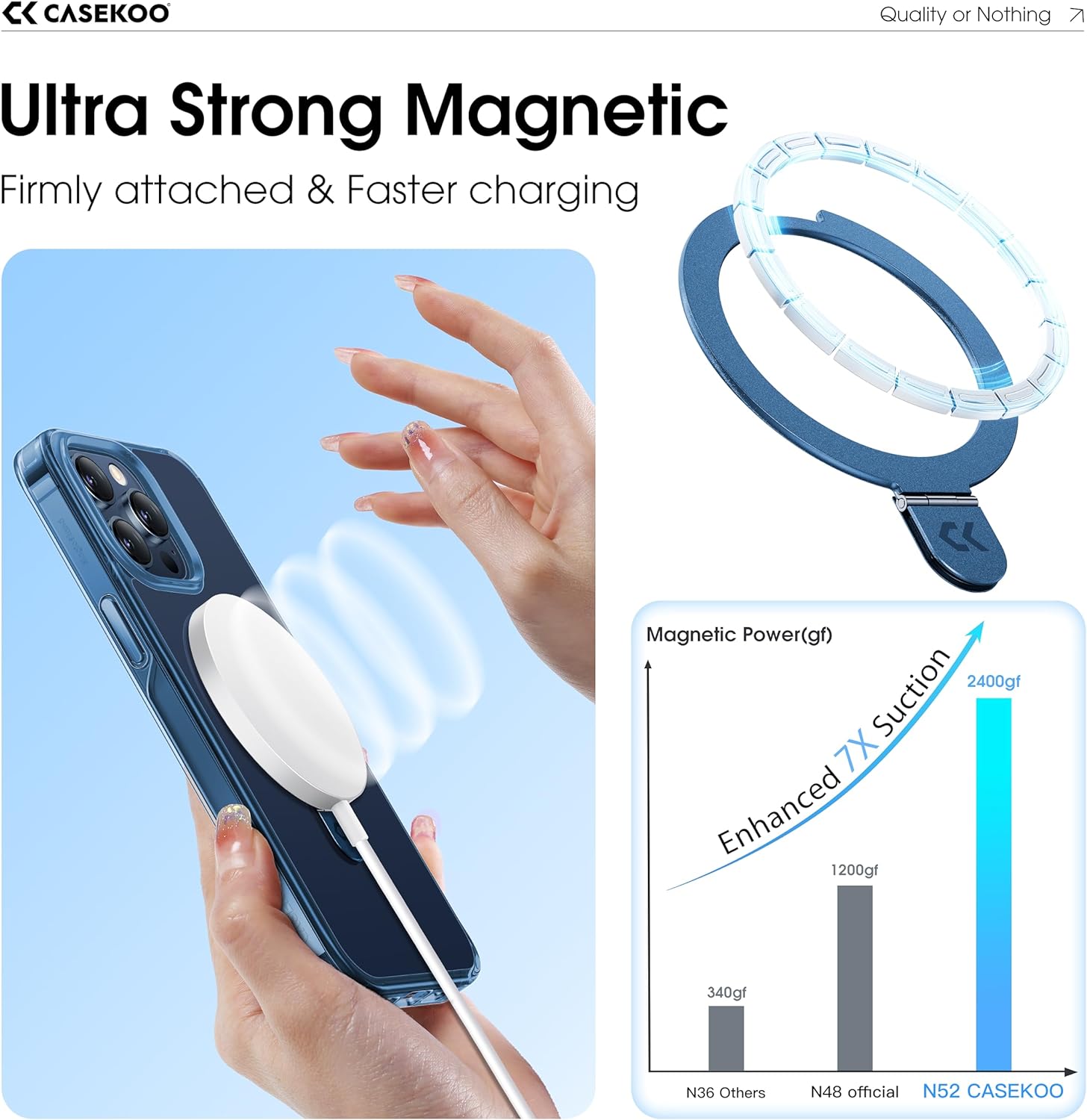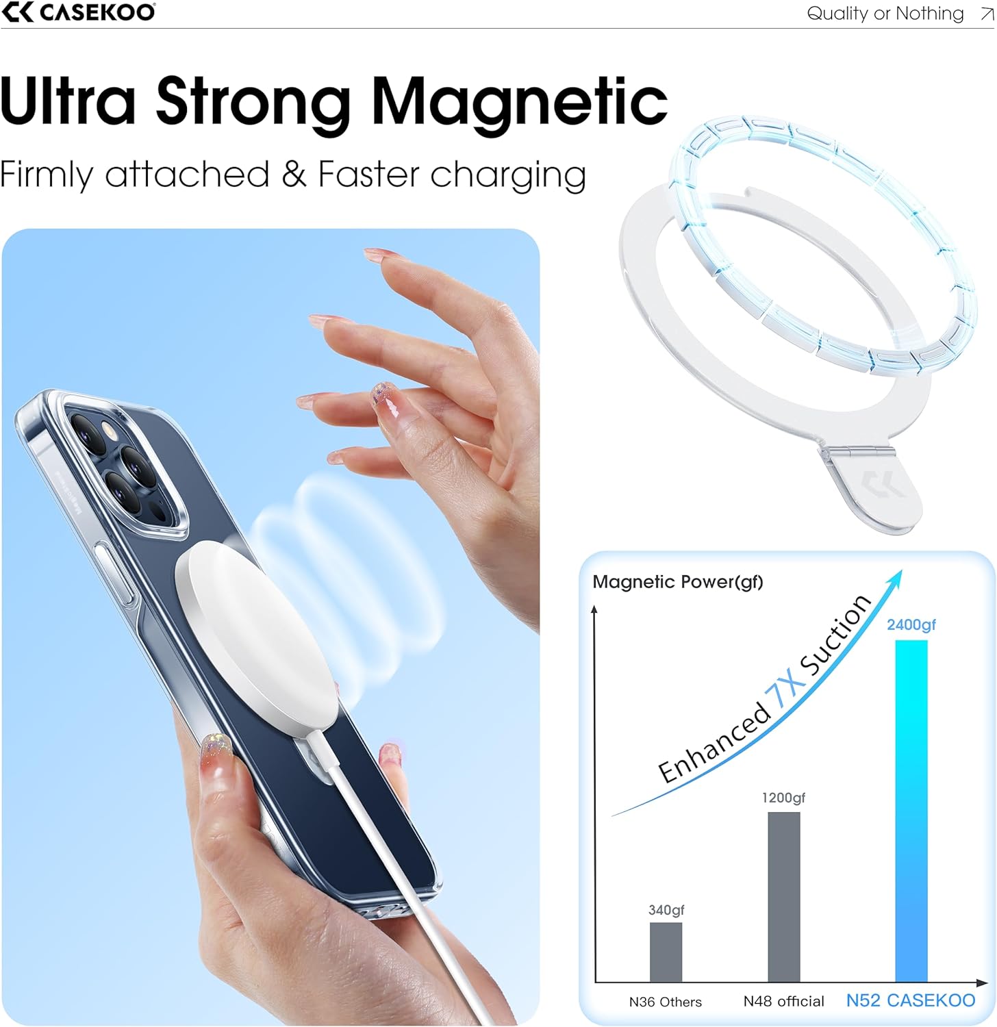 • [Super Magnetic Properties] The magnetic ring on the back of the CASEKOO mobile phone case uses 48 N52 magnets in a Halbach array to achieve a suction force of 2400 grams. 200% stronger suction than bare metal or official cases. Ensures a secure connection with all accessories. The precisely aligned design achieves a 1:1 maximum output for fast and safe charging.