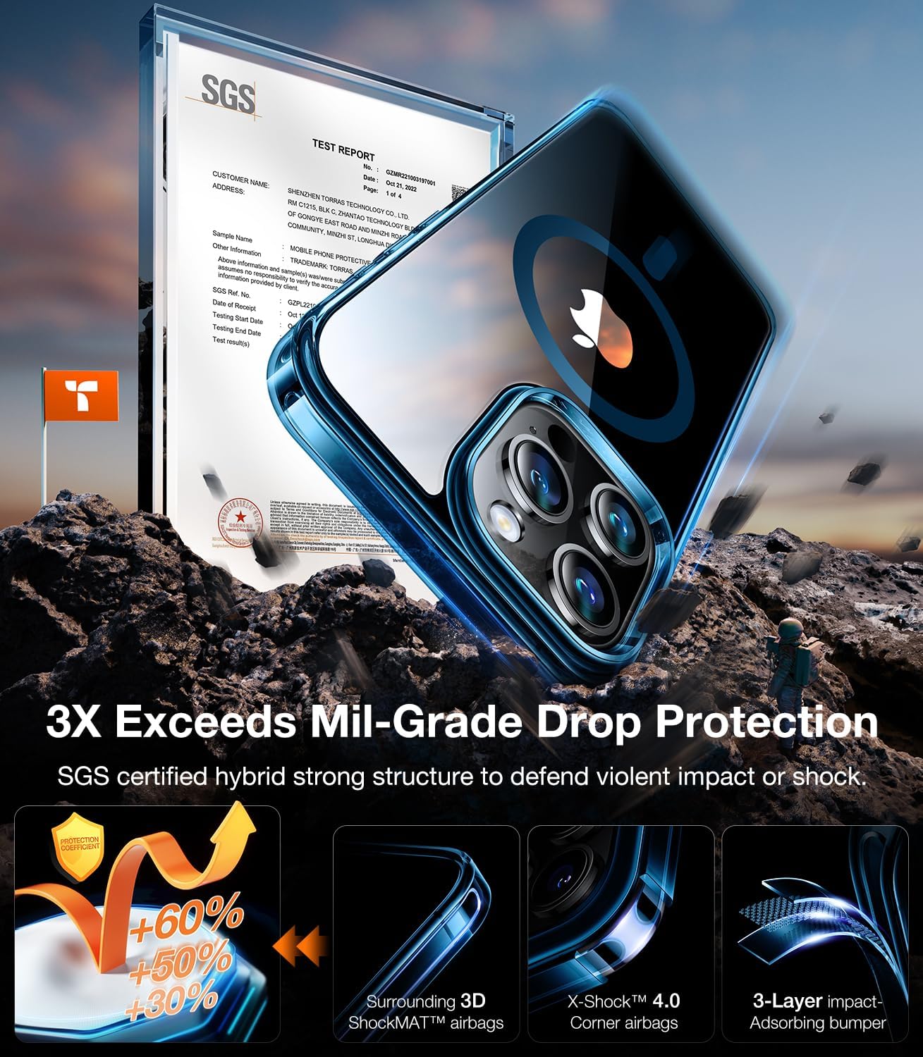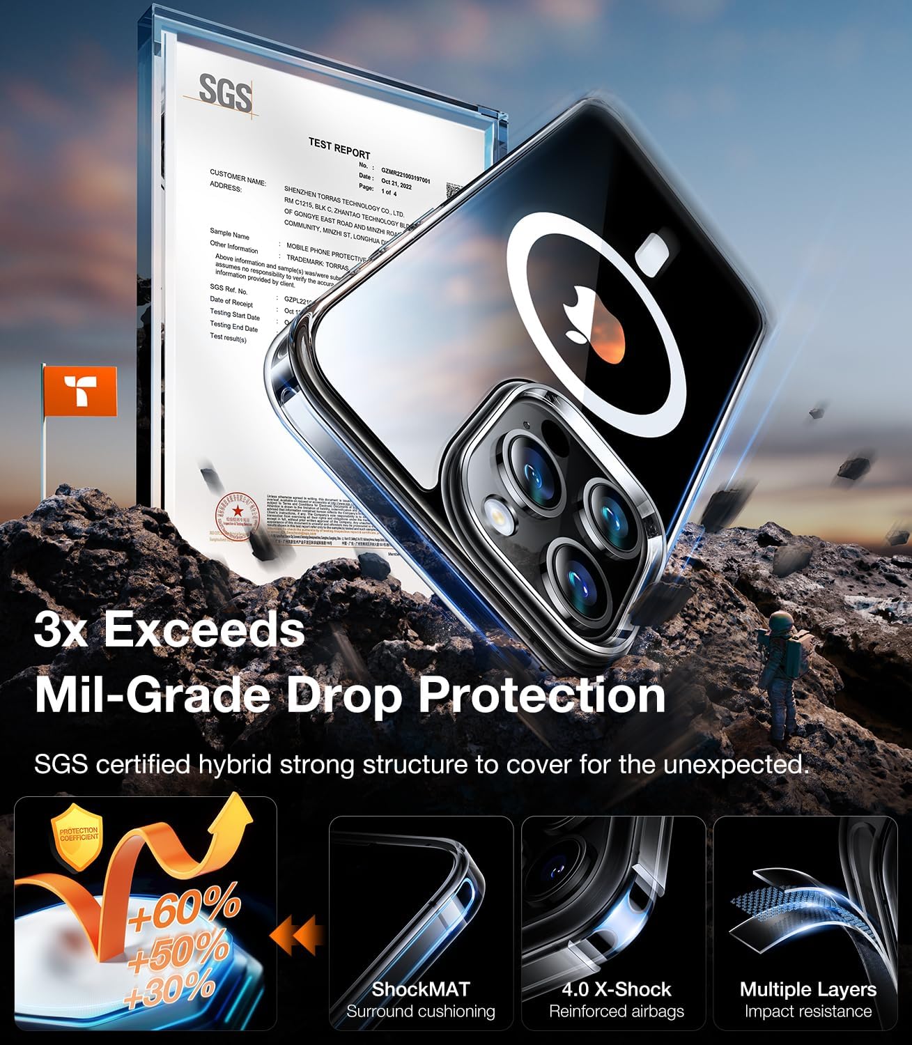 • 👍【3x Exceeds Military Grade Protection】TORRAS for iPhone 15 Pro Max shockproof case passed 12FT Mil-grade shockproof certification(SGS). 8000+ rigorous drop tests at 50+ different angles to ensure complete peace of mind. The upgraded 4.0 X-Shock airbags, 3-ply bumper and surrounding ShockMAT cushion effectively minimize impacts upon every possible shock. Raised screen bezel and camera lip and exclusive L-SHOCK camera airbag to prevent the delicate parts of your phone from dents and scratches.